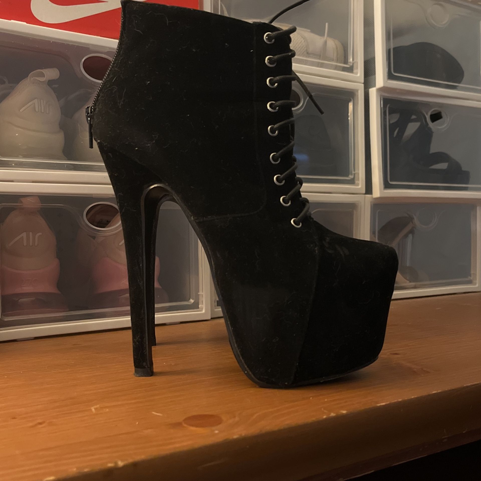 Black suede boots/booties size 6 fro Lola’s Boutique. Worn only a few times. Very tall with platform.
