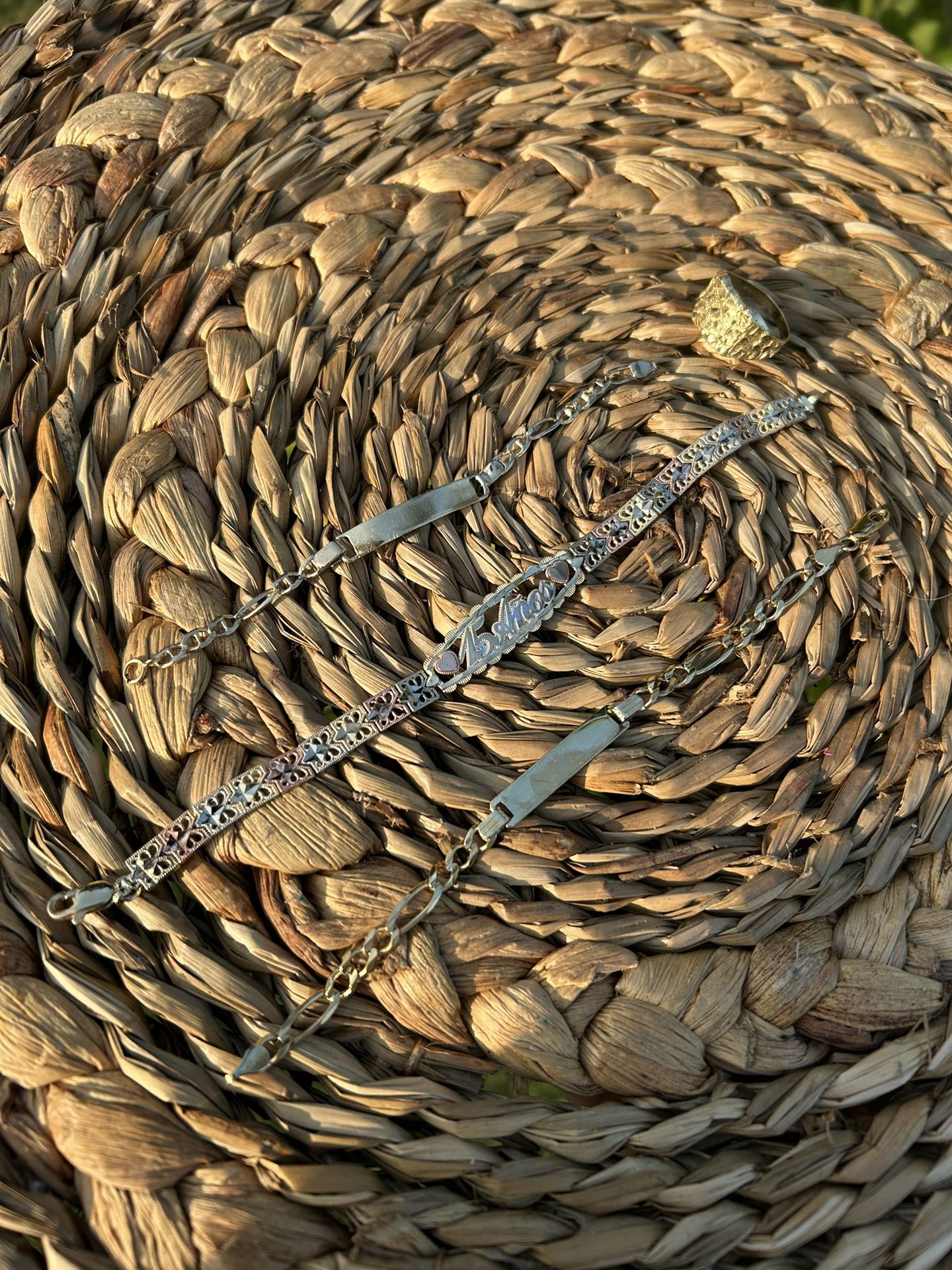 15 Anos Bracelet 10K sweet sixteen Tri Color Gold 7.80 G 14K Baby Bracelet Figaro 2.98 G 14K Cuban Bracelet Cuban 5.40 G Nugget Ring sz 9.5 270$ Ask us about prices