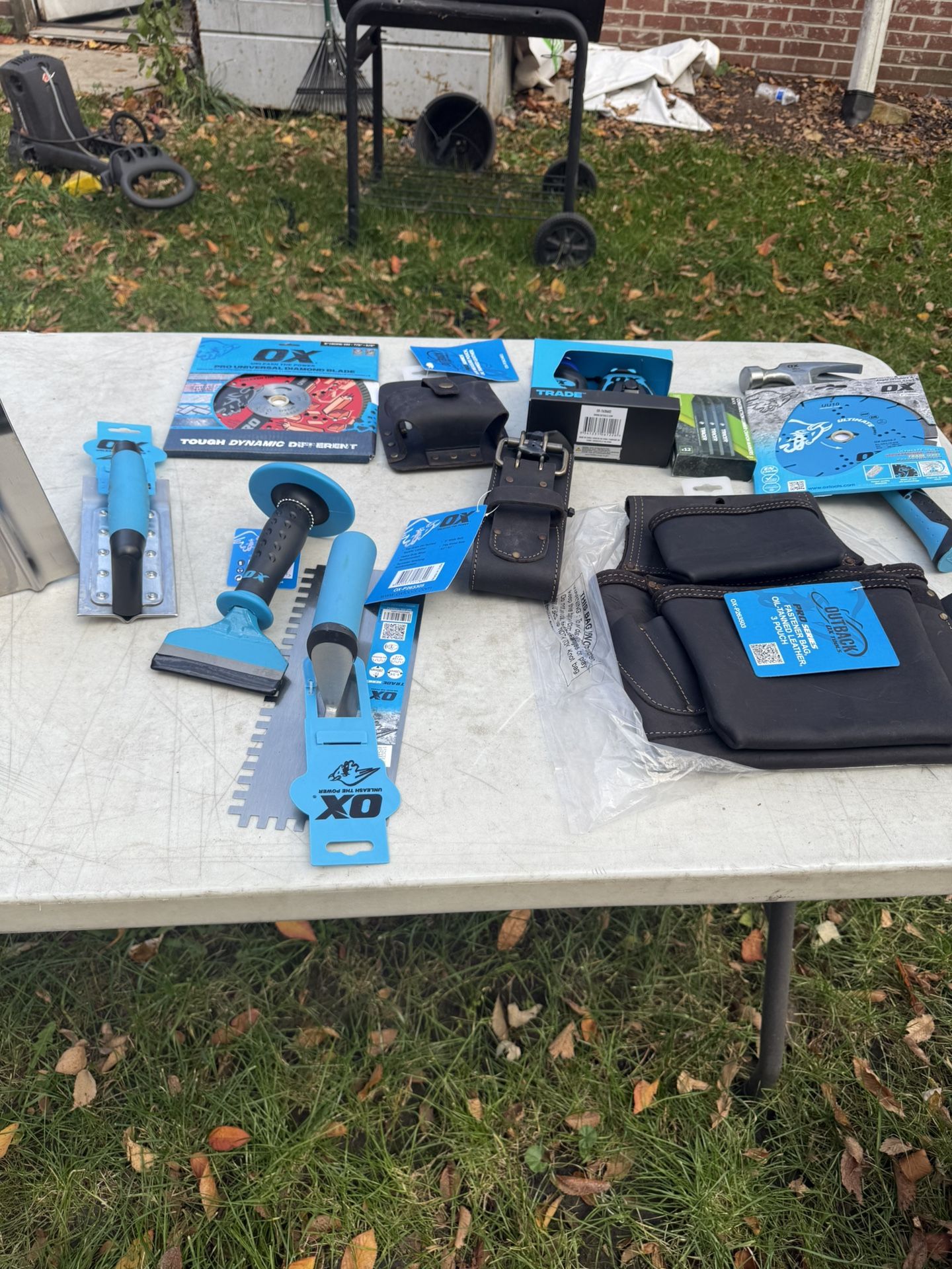 All brand new ox tools price varies. Leather pouch Tool belt Tape measure pouch Diamond blade 8” Chalk line Hammer Canyon markers Duragrip handle