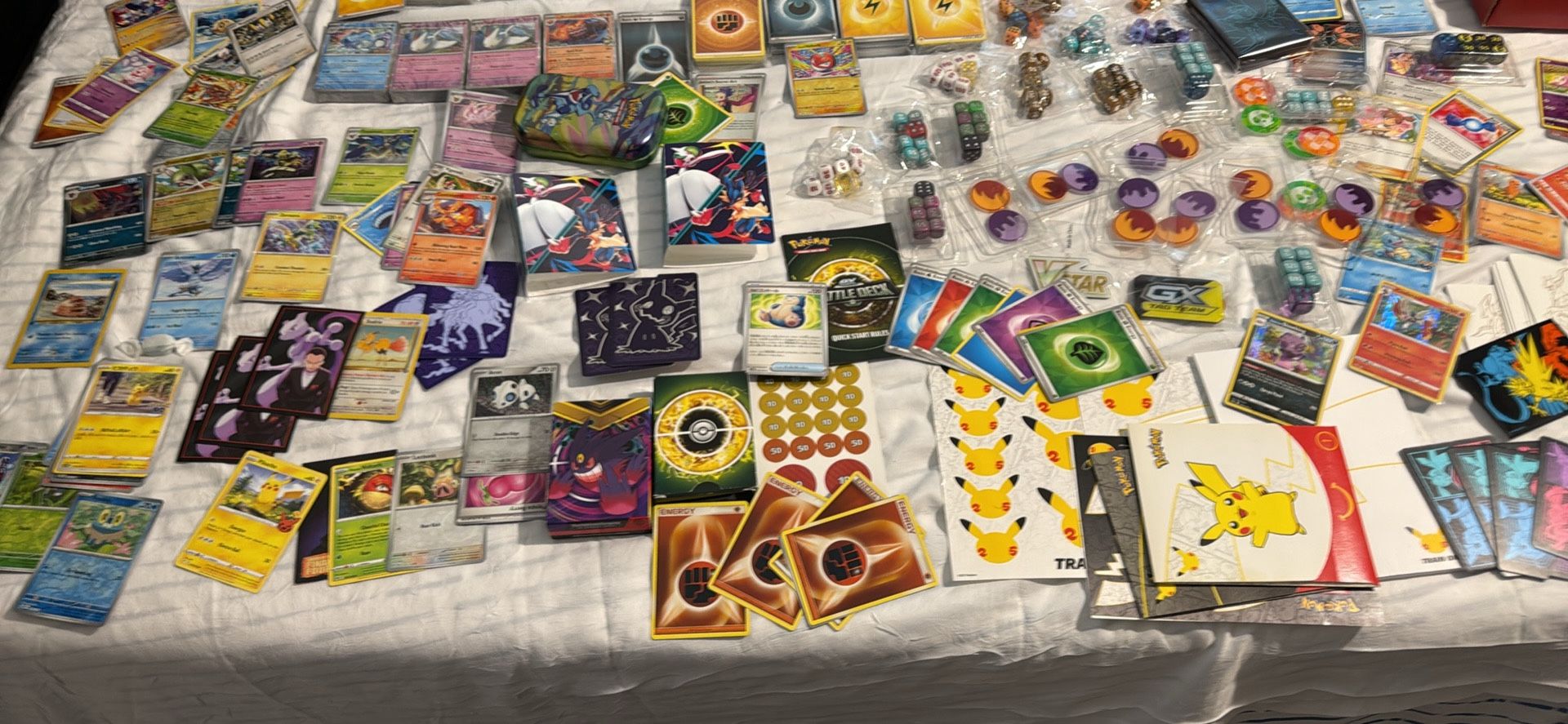 I have maybe over 2 thousand cards in this deal over 60 nice coins . 24 energy packs. 4 new sealed promo card packs.15 dice packs plus 11 more sealed packs of orange n purple chips .6 s’more little binders Reverse holo cards n moreover 20 packs of sleaves n more ect