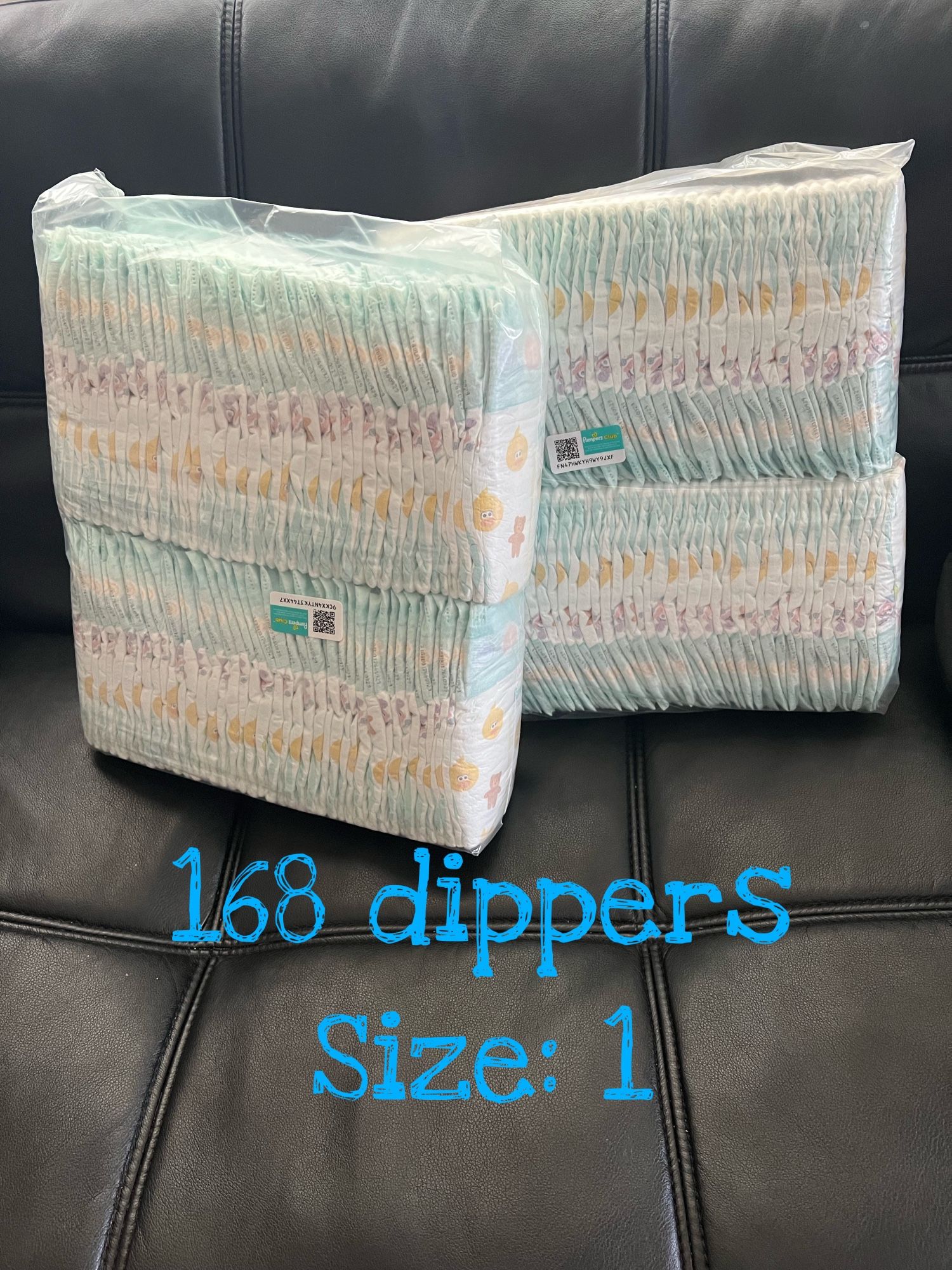 There are 168 diapers, the bags are new and sealed, but I no longer have the box. I am asking $35 firm price. Size: 1