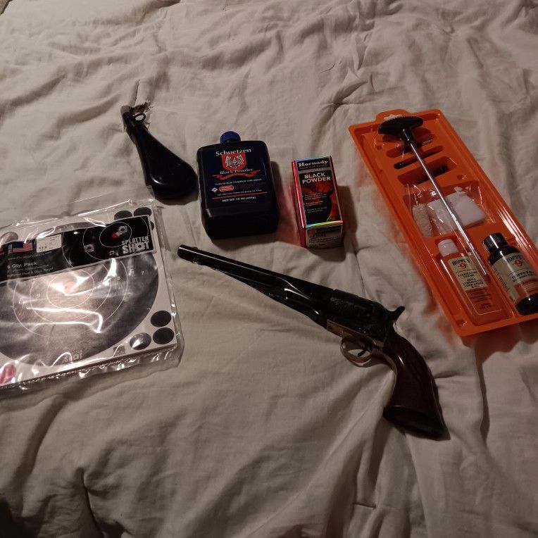 Black.\nPowder pistol for with the powder , the bullets cleaning kit and holster.