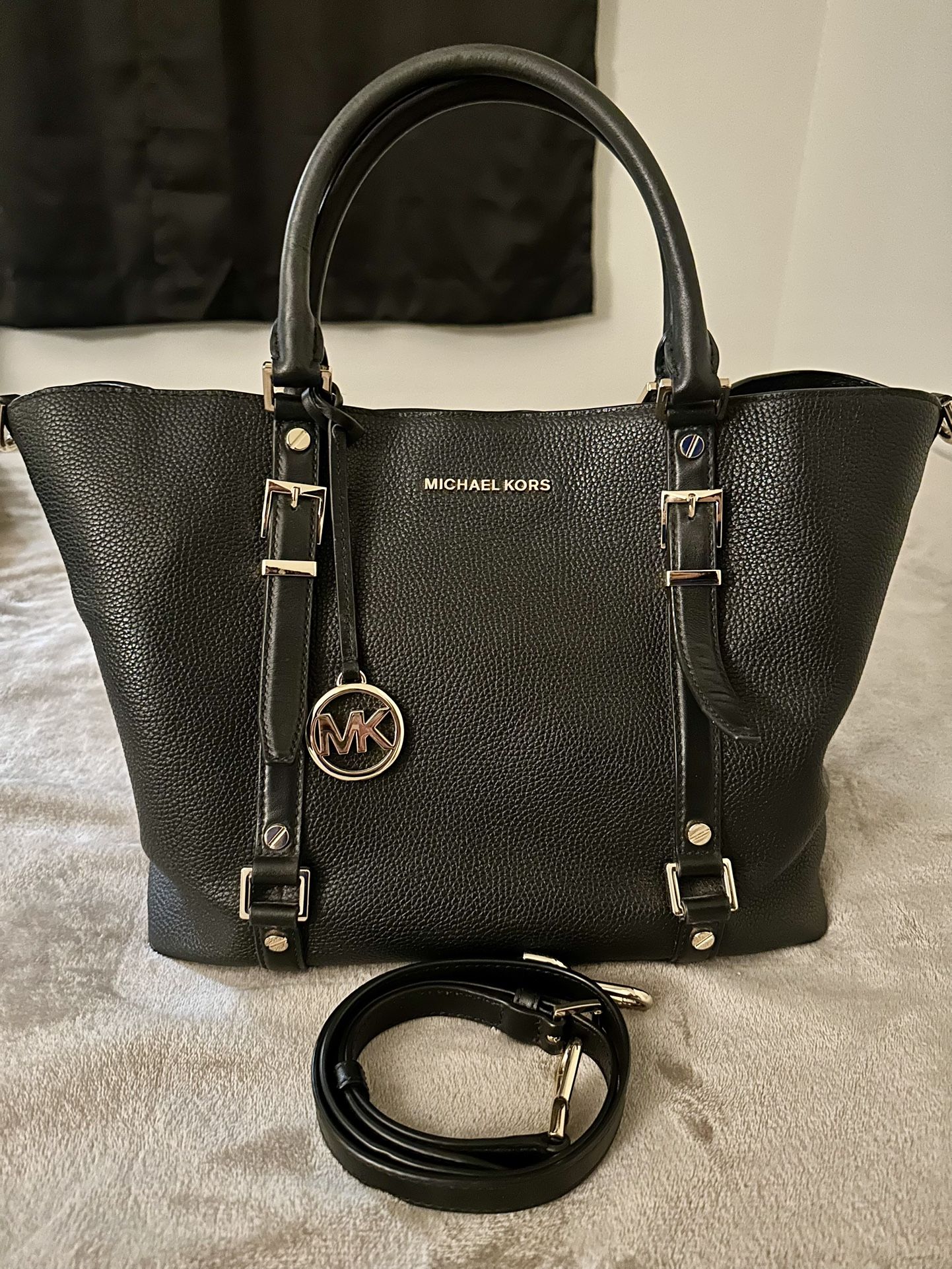 $40.00 Pebble Leather 14”W x 11”H x 6”D Dual Handle drop 5.5” Convertible Design: Interior Clip clinches bag for a sleeker look Adjustable long Strap: 18.75” drop Magnetic Snap closure Inside zip pocket, 2 open pockets, 6 slip pockets and key clip Gold tone hardware Protective feet Clean, Smoke-free home Cash Only. No Trades.