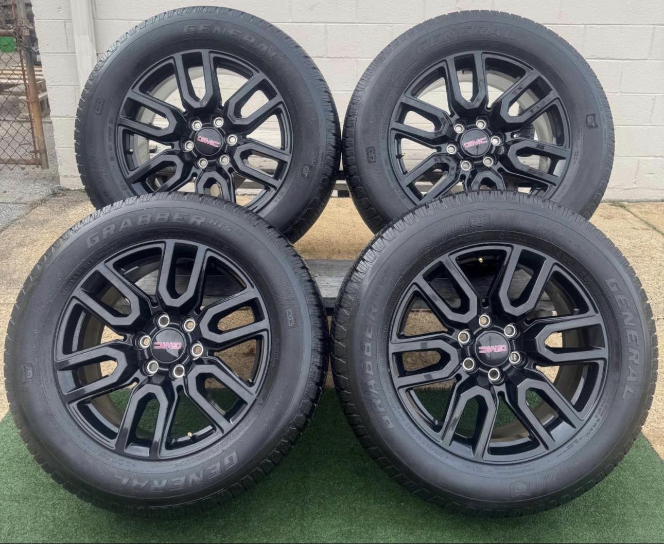 Set of 4 OEM GMC black wheels with General Grabber HTS tires. Very clean,r eady to mount. β’ π₯ Size: 18 inch β’ π Tires: General Grabber HTS β’ π Bolt Pattern: 6x139.7 (6x5.5) β’ π GMC center caps included β’ π€ OEM black finish β’ π― No issues, balanced and ready to go Fits: β’ GMC Sierra 1500 β’ GMC Yukon / Yukon XL β’ Chevy Silverado 1500 β’ Chevy Tahoe / Suburban β’ Chevy Avalanche (Any model with 6-lug 6x139.7 bolt pattern) π Local pickup in Delaware π¦ Shipping available anywhere in the USA (extra) π© Message me if you want installation or more wheel/tire sets! π₯ First come, first served.