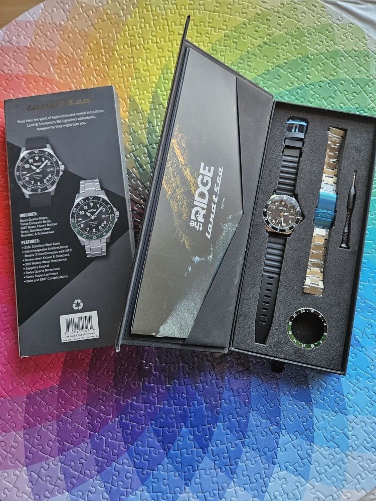 Swiss Quartz Watch, Time/Compass Bezel, GMT Bezel, Fluoro Rubber Strap, Stainless Steel Bracelet, & Screwdriver