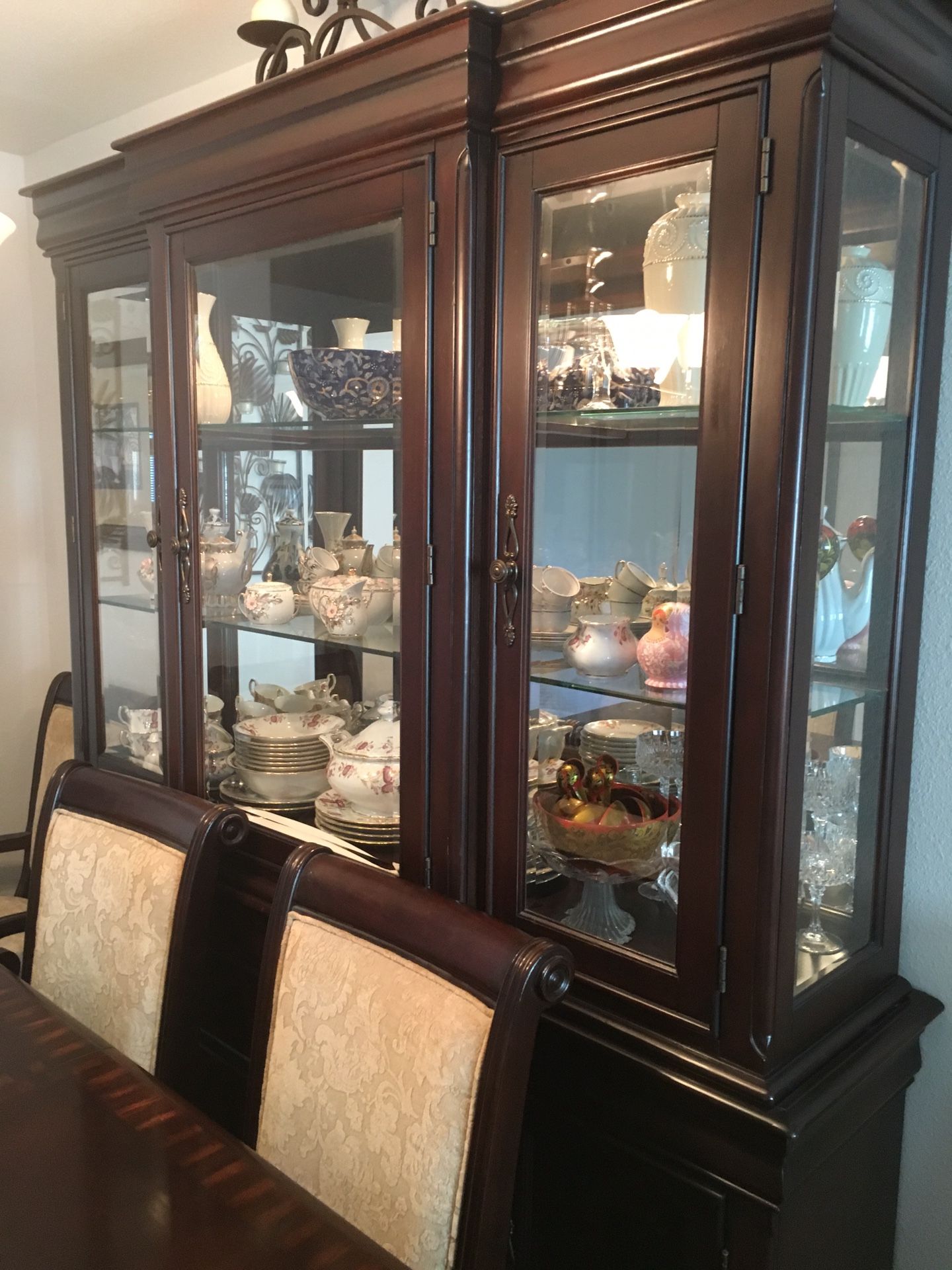 Hutch with Lights. And extendable table with 8 chairs.