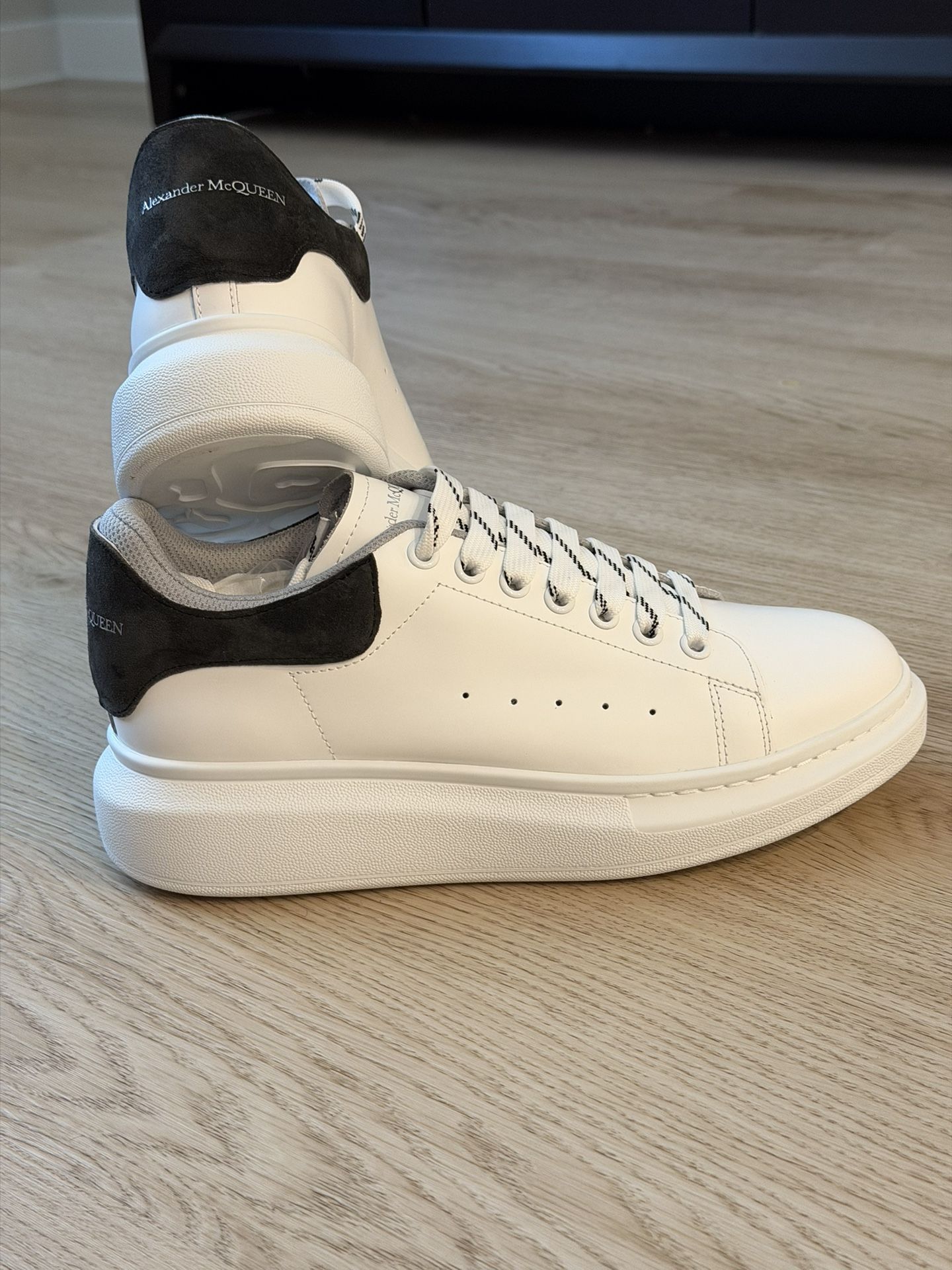 Brand new Alexander McQueen sneakers in a classic white and black colorway. These shoes feature a clean, modern design with premium leather, offering both style and comfort. They are size 9 and have never been worn. Perfect for casual or smart-casual outfits, these sneakers are a timeless and versatile addition to any wardrobe.