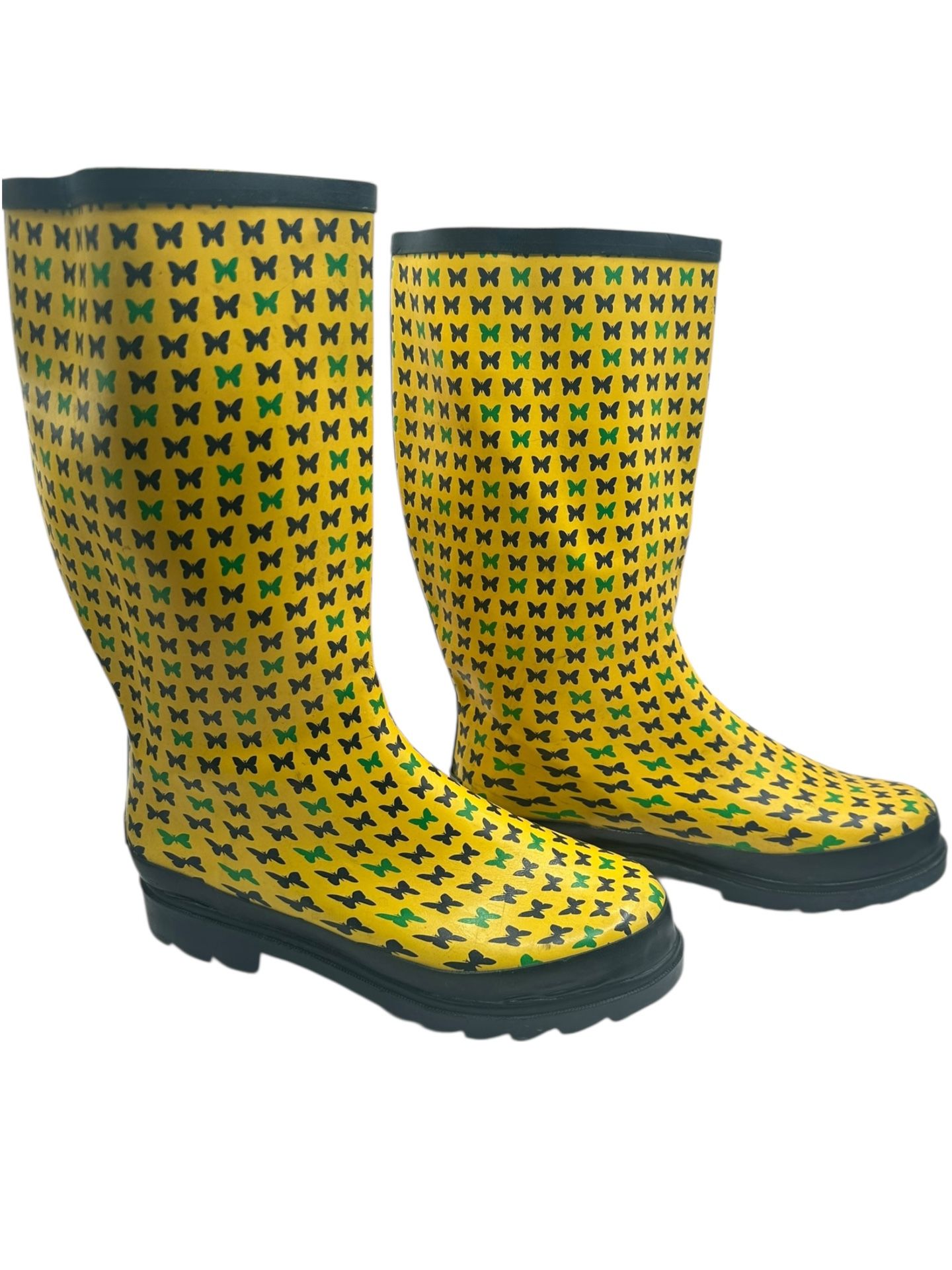 123 Girl Butterfly Rain Boots, Rubber, Size 8 Bright and cheerful 123 Girl rain boots featuring an allover butterfly print in yellow with black and green accents. Made from waterproof rubber with a sturdy treaded sole for rainy days, puddle jumping, and outdoor play. Pull-on knee-high style with roomy shaft for easy on and off. Pre-owned with normal signs of wear but lots of life left. Easy-care rubber exterior—wipe clean with a damp cloth and air dry. See pictures for tape measurements. Flaws Include: Light surface scuffs and discoloration consistent with normal wear Minor interior wear visible near inner lining Tread shows wear but remains functional
