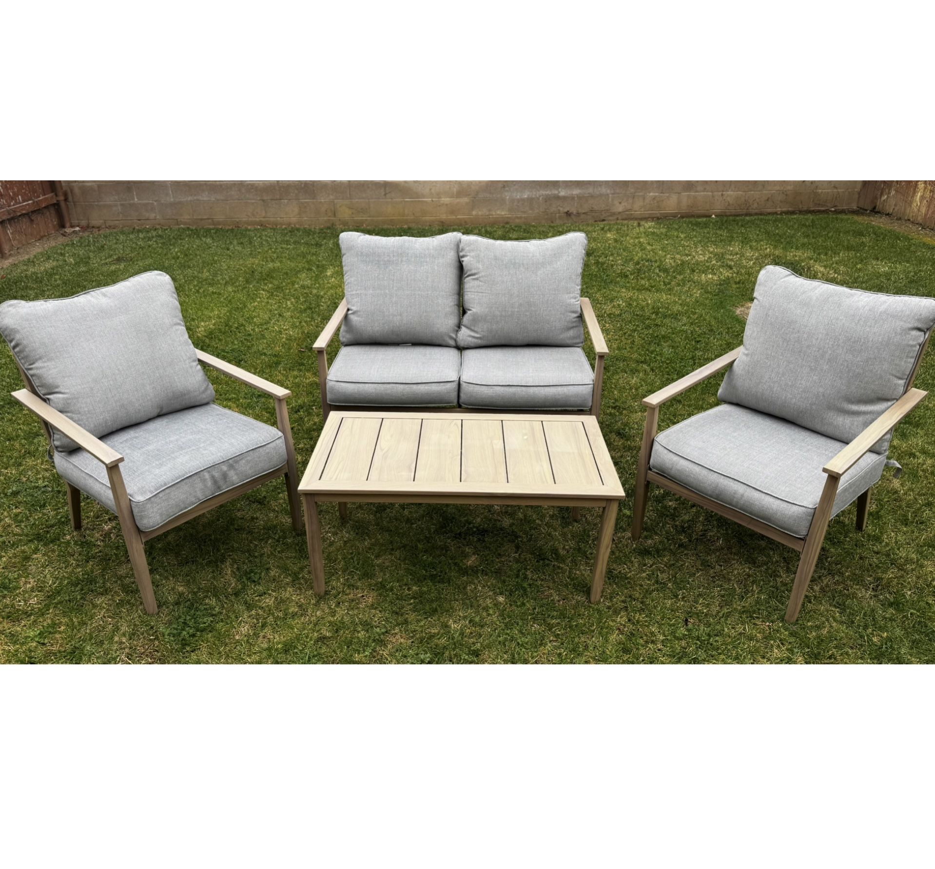Hampton Bay Alderton 4-Piece light Brown Metal Outdoor Patio Seating Set Standard Stone Gray Cushions with cushion guard technology Set includes 2 chairs, 1 loveseat and 1 coffee table (woodgrain finish) Chair: 30.7 in. x 25.5 in. x 33.86 in., loveseat: 30.7 in. x 47.5 in. x 33.86 in., coffee table: 40 in. x 20 in. x 18.11 in. Originally $679 from The Home Depot VGUC with some imperfections (see photos) Pick up Chino Hills