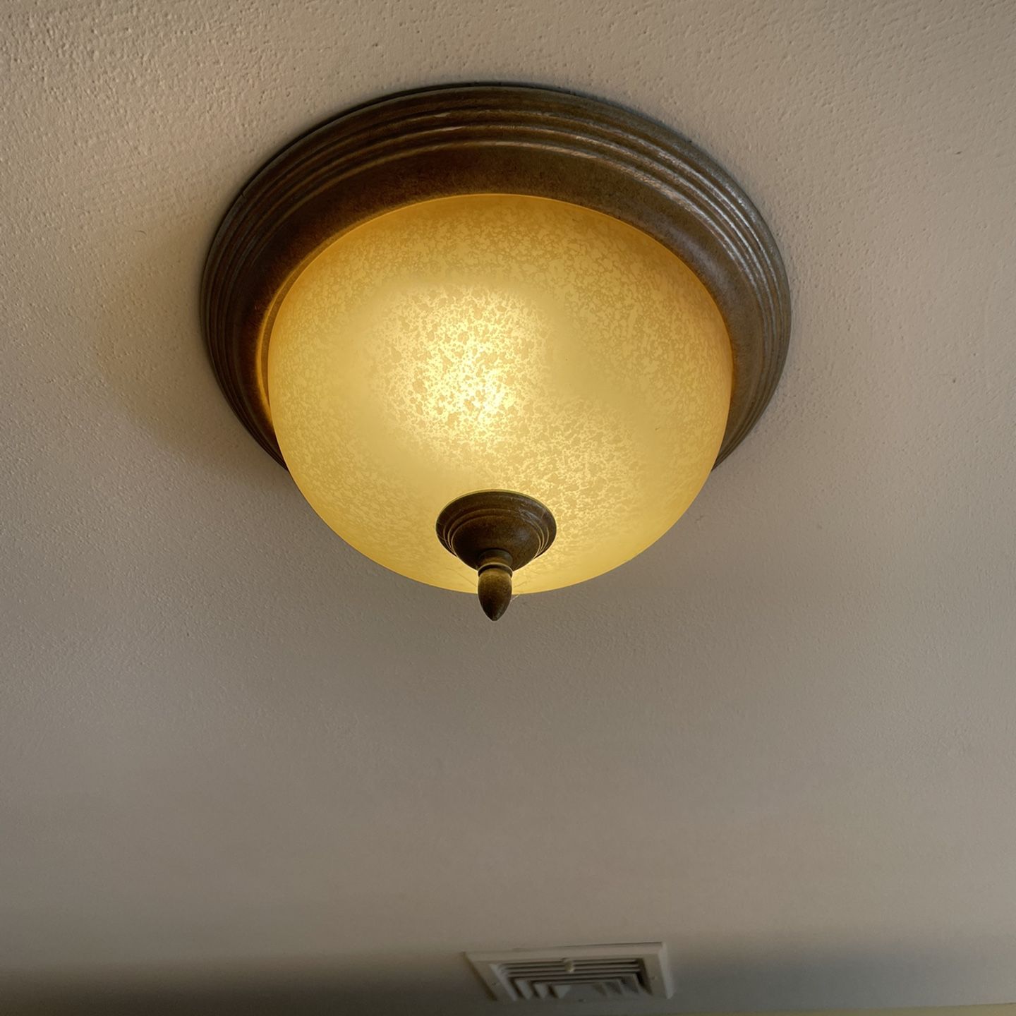 Hardwired flush mount ceiling light. Works great!Neutral color with frosted glass dome.