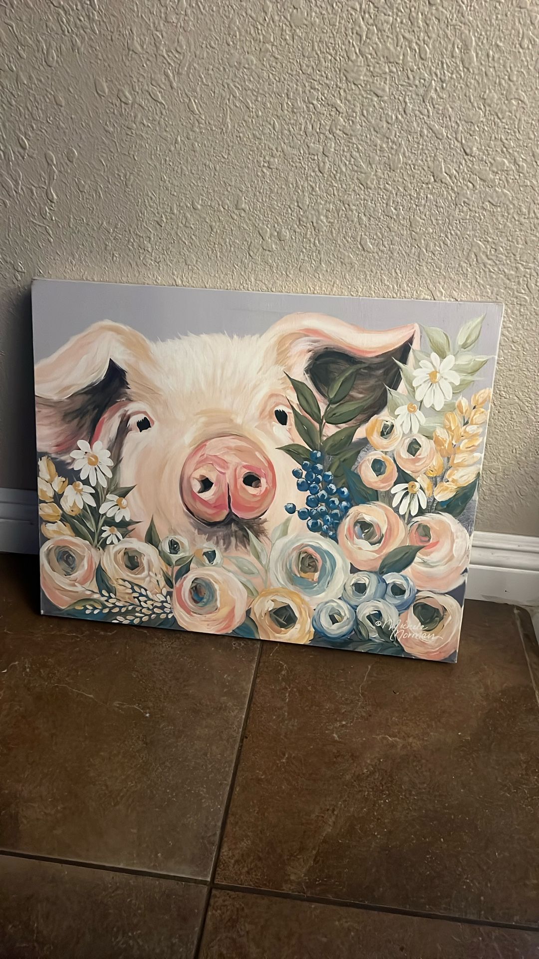 Cute wall art of pig surrounded by flowers. Good condition. Measures 20in L x 16in H x 1.5 W.