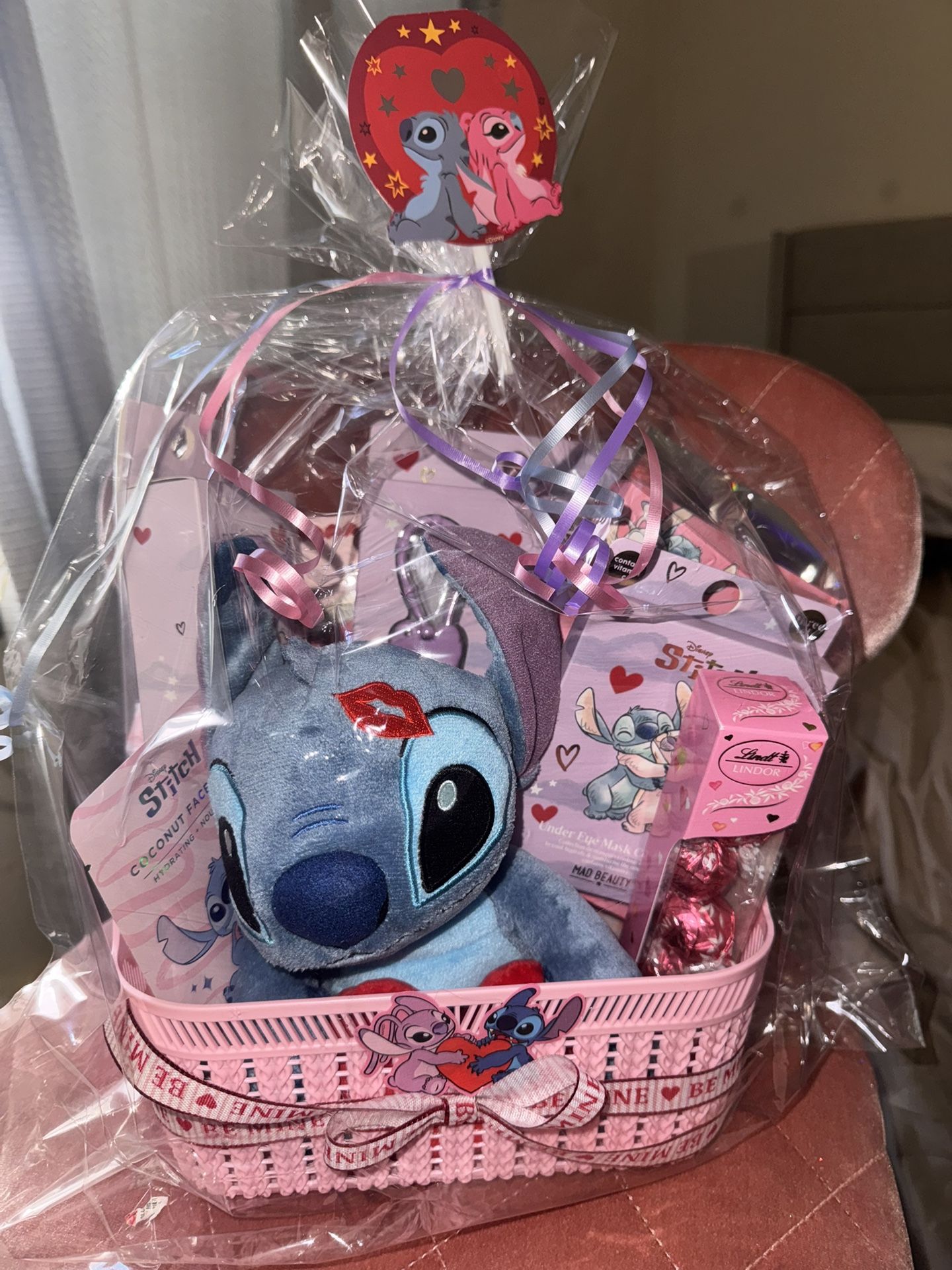 Under eye patch, keychain lip balm, 2 makeup blender sponges,hair brush , lindor chocolates , stitch ballon , stitch plushie 9 in height,coconut face mask hidrating, nail files.