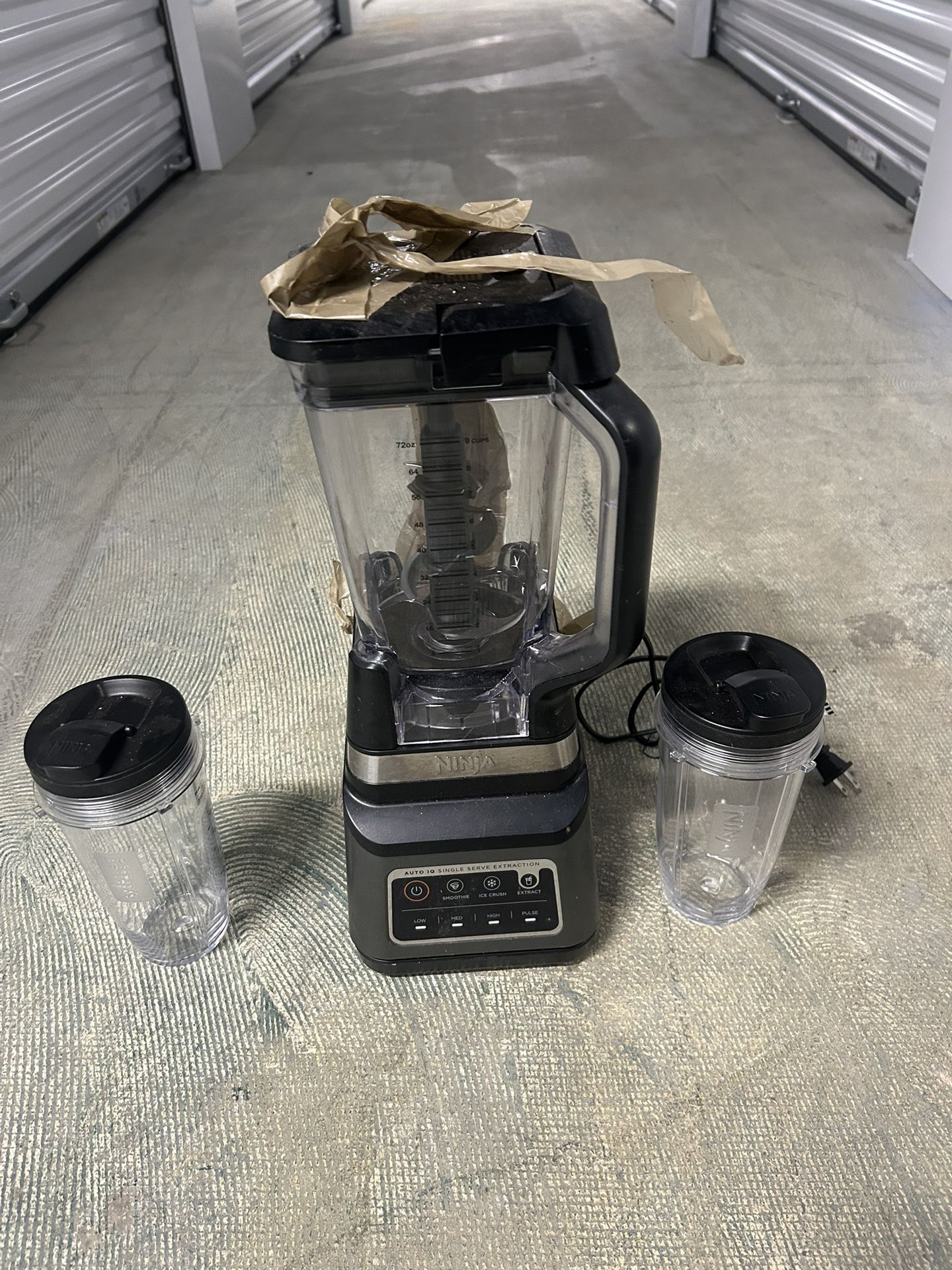 Ninja Auto-iQ blender with single-serve cups included. Powers on. No additional testing performed. Item is sold as-is from storage. No cleaning or preparation has been done. May show light dust or storage-related signs. Price reflects this. Buyers are welcome to inspect prior to purchase. Pre-owned item sold as-is. No guarantees or returns. Pickup only. No halfway meetups. Delivery available for an additional prepaid fee. Serious inquiries only.