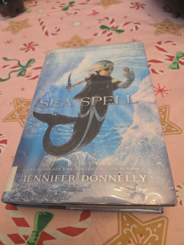 Sea Spell book by Jennifer Donnelly. Book 4 in the Waterfire Saga. Was a library book at a school that was given away. The inside is ripped a little and has a red stamp on it.