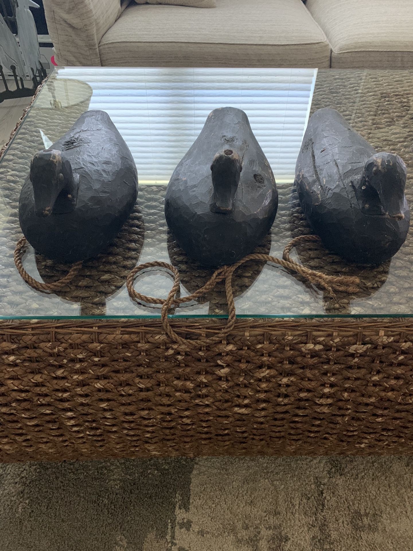 Three vintage black duck decoy carvings. Carver is unknown, but they are mid century due to their unique design. $750.00 for all three or $300.00 a piece.