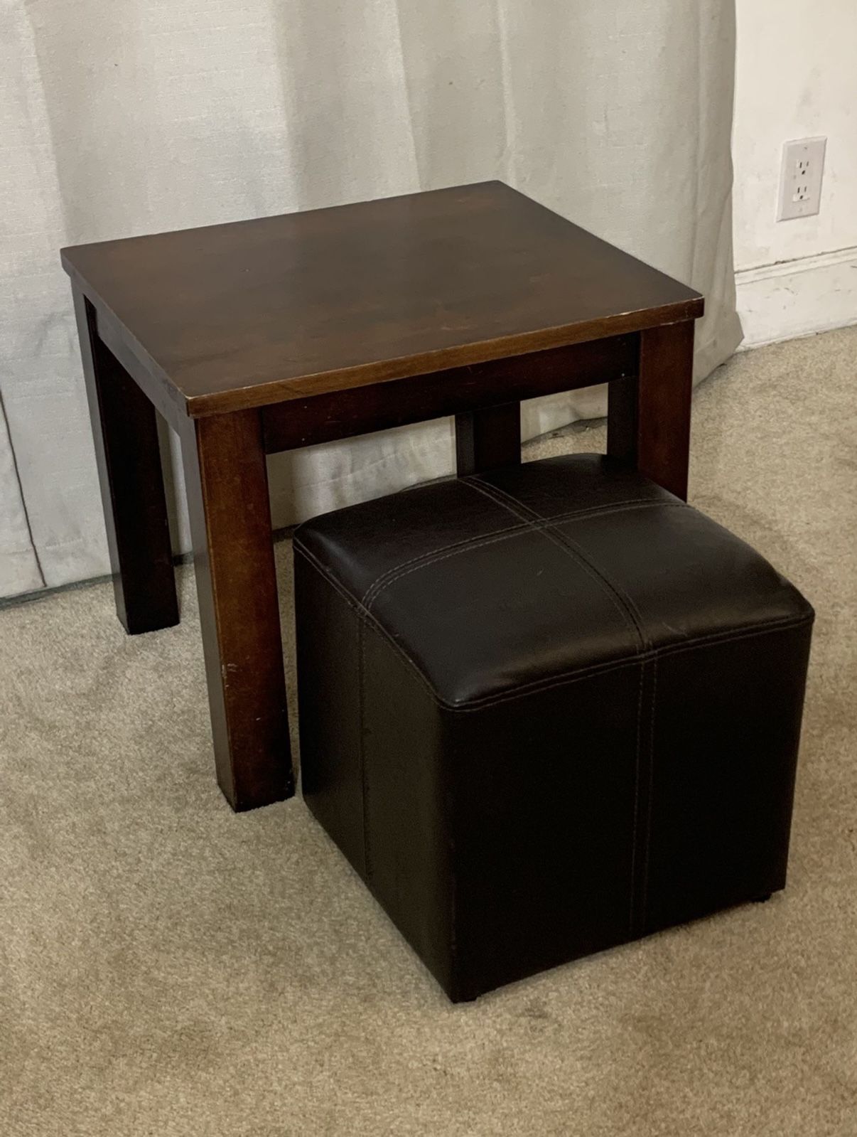 PICK UP ONLY Small side/end table with ottoman. Cute little set. Great for small places. Perfect for holding a lamp and your phone then kicking up your feet on the ottoman. Good used condition. Sold together. Measurements Table: 29” x 18” x 19” H Ottoman: 14” x 14” x 13” H