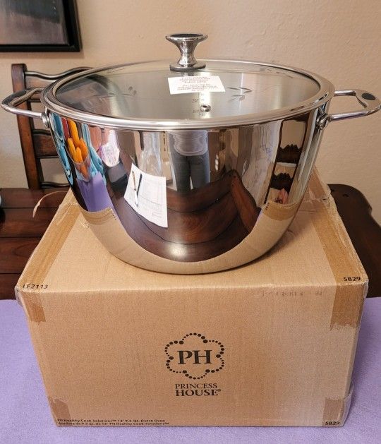 PH HEALTHY COOK-SOLUTIONS Asadora de 9.5 qt. de 12" 5829 Nueva en su caja Olla de acero inoxidable de Princess House Asadora de 9.5 qt. de 12". • Construcción TL3 de alto rendimiento asegura la distribución uniforme del calor para que los alimentos se cocinen uniformemente. • La Asadora se apila fácilmente entre otras ollas Princess House Healthy Cook-Solutions™ de 12" para ahorrar 35% del espacio (comparado cuando no están apiladas)..