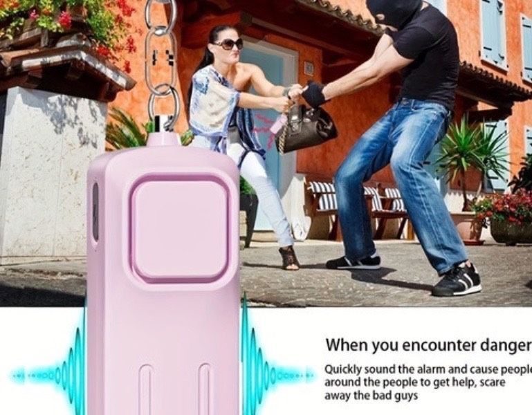 Personal safety alarm. Issues hi frequency. 130 dB will easily scare away intruders.