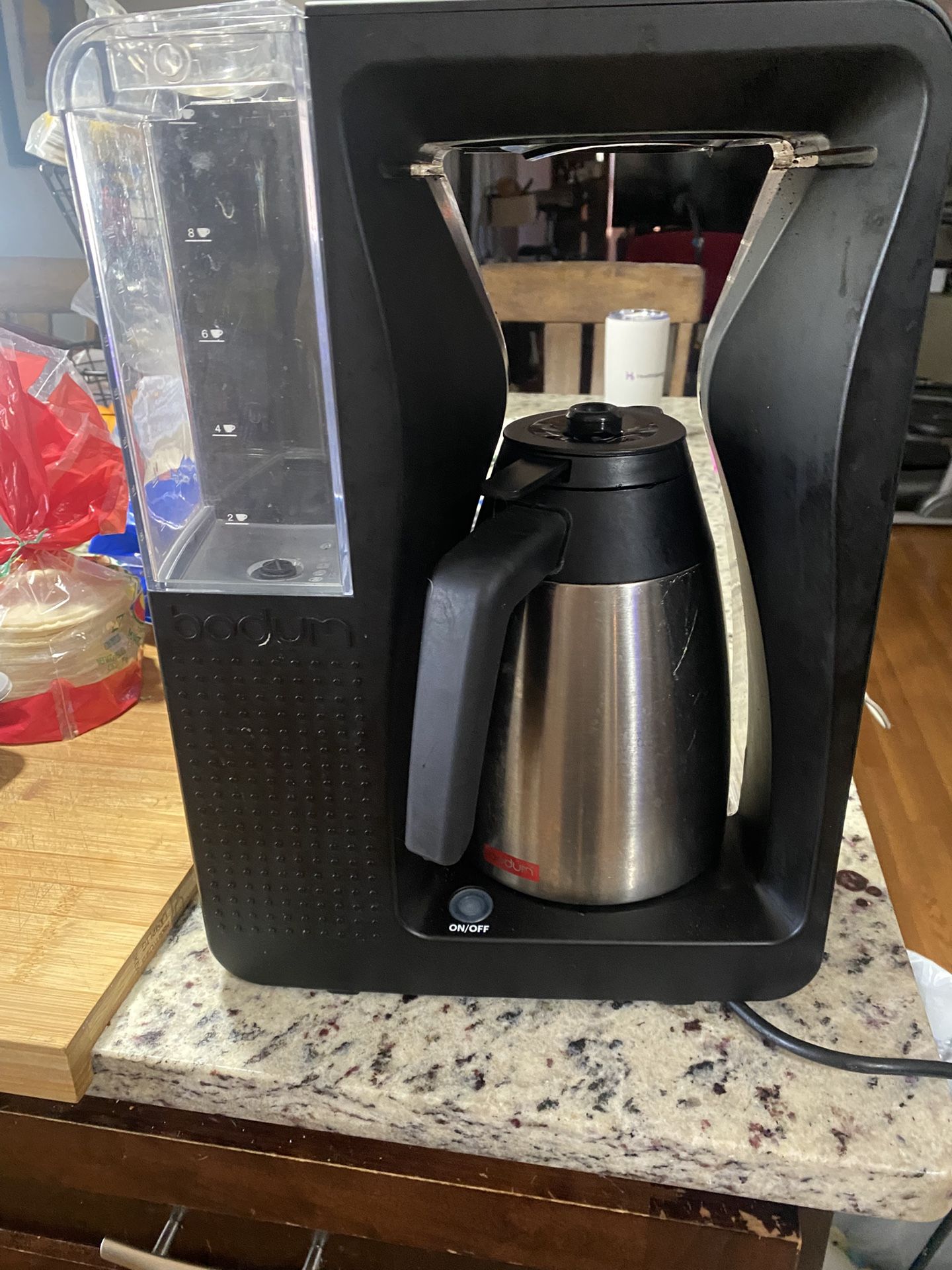 OffERS FOR PARTS :MISSING 1 PART only Bodum 11001 Bistro automatic pour over coffee machine with thermal carafe, complete except for item number 7 coffee filter , that holds coffee, husband dropped it and it cracked. If you have one of these coffee brewers , i’m sure you love it as i did , but parts for this item are no longer sold. Selling for parts only, complete with booklet except for filter , item no 7.