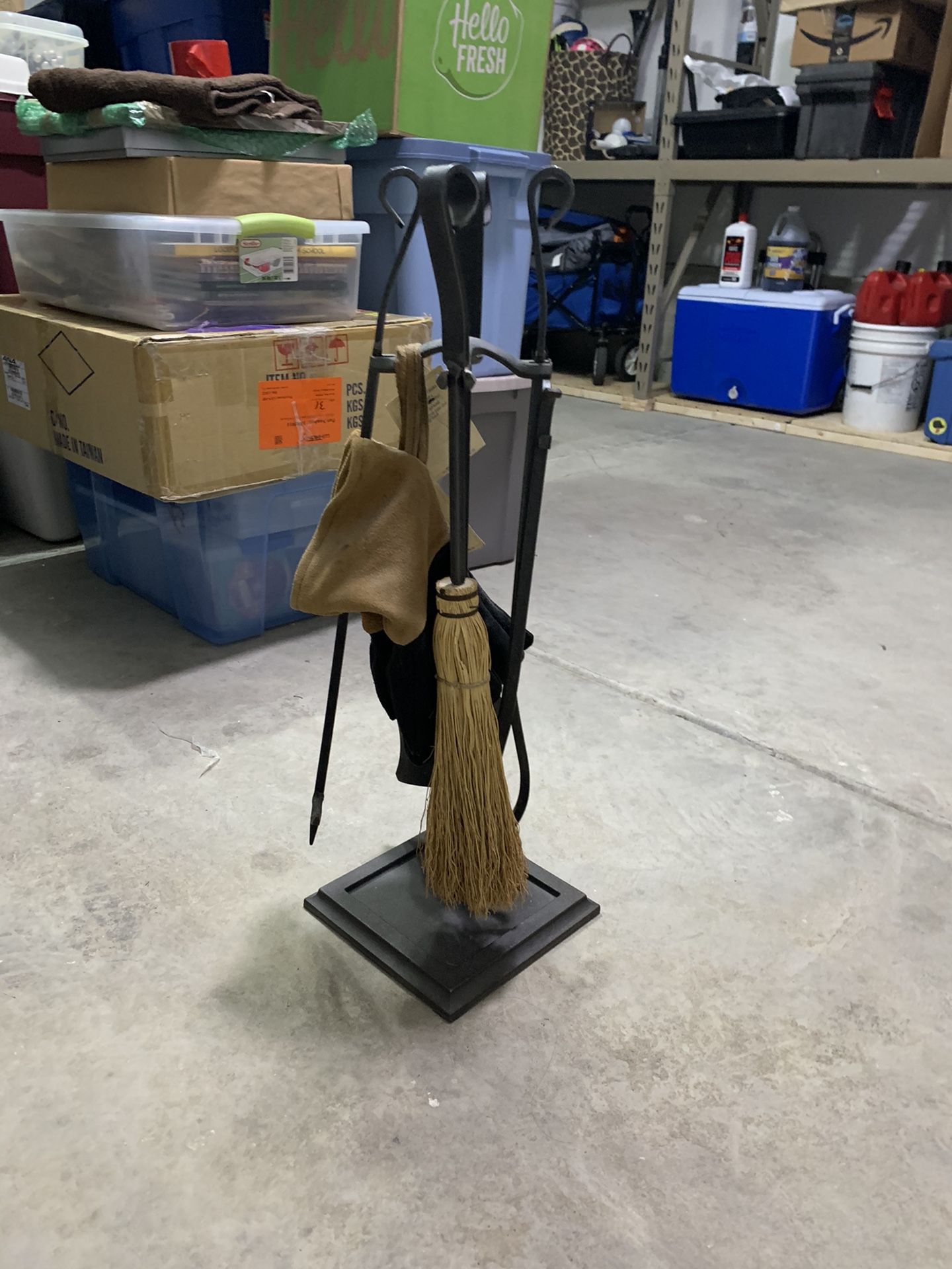 Barely used. Broom never used. Pilgrim Brand. Eddie Bauer heavy duty leather fireplace or grill gloves