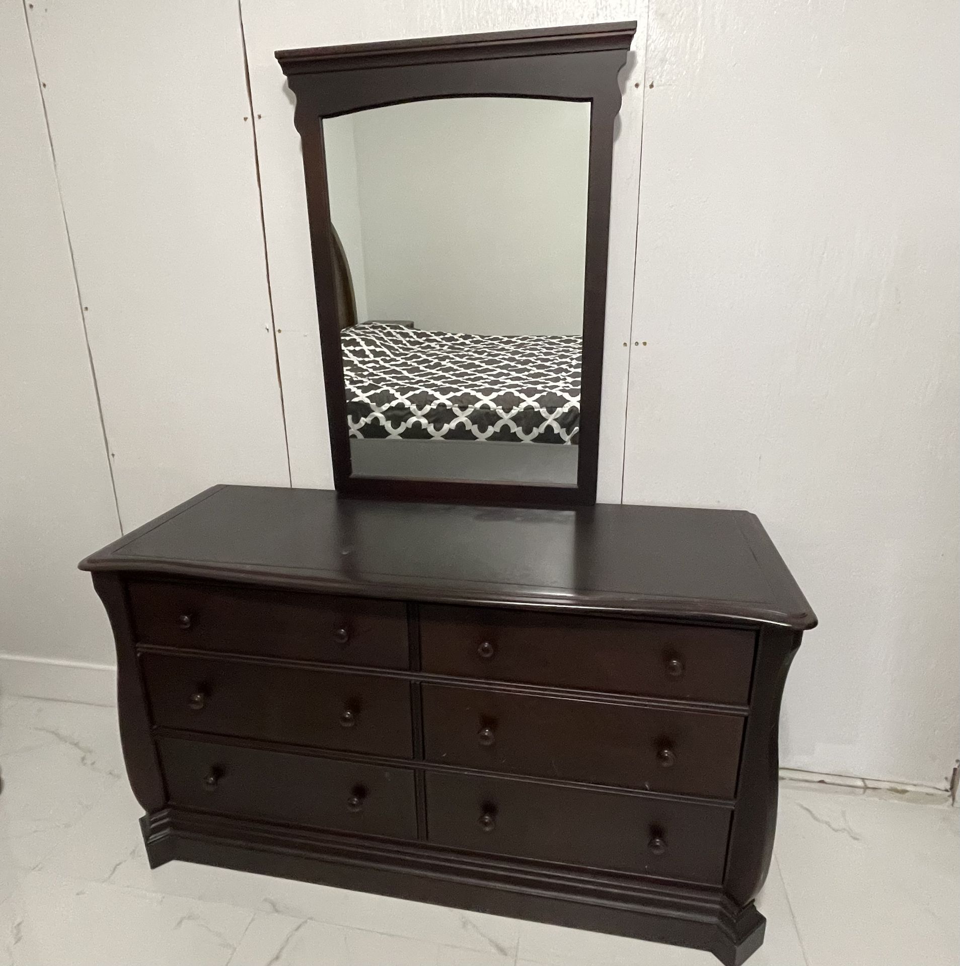 Dark wood bedroom set featuring a 6-drawer dresser with attached mirror and a matching nightstand. Solid and functional with plenty of storage space. Minor scuffs and scratches are visible from normal use, but overall in good condition. Dimensions: Dresser: • 58” W x 21” D • 32” H Mirror: • 41” W x 27.5” H Nightstand: • 23” W x 18” D • 24” H