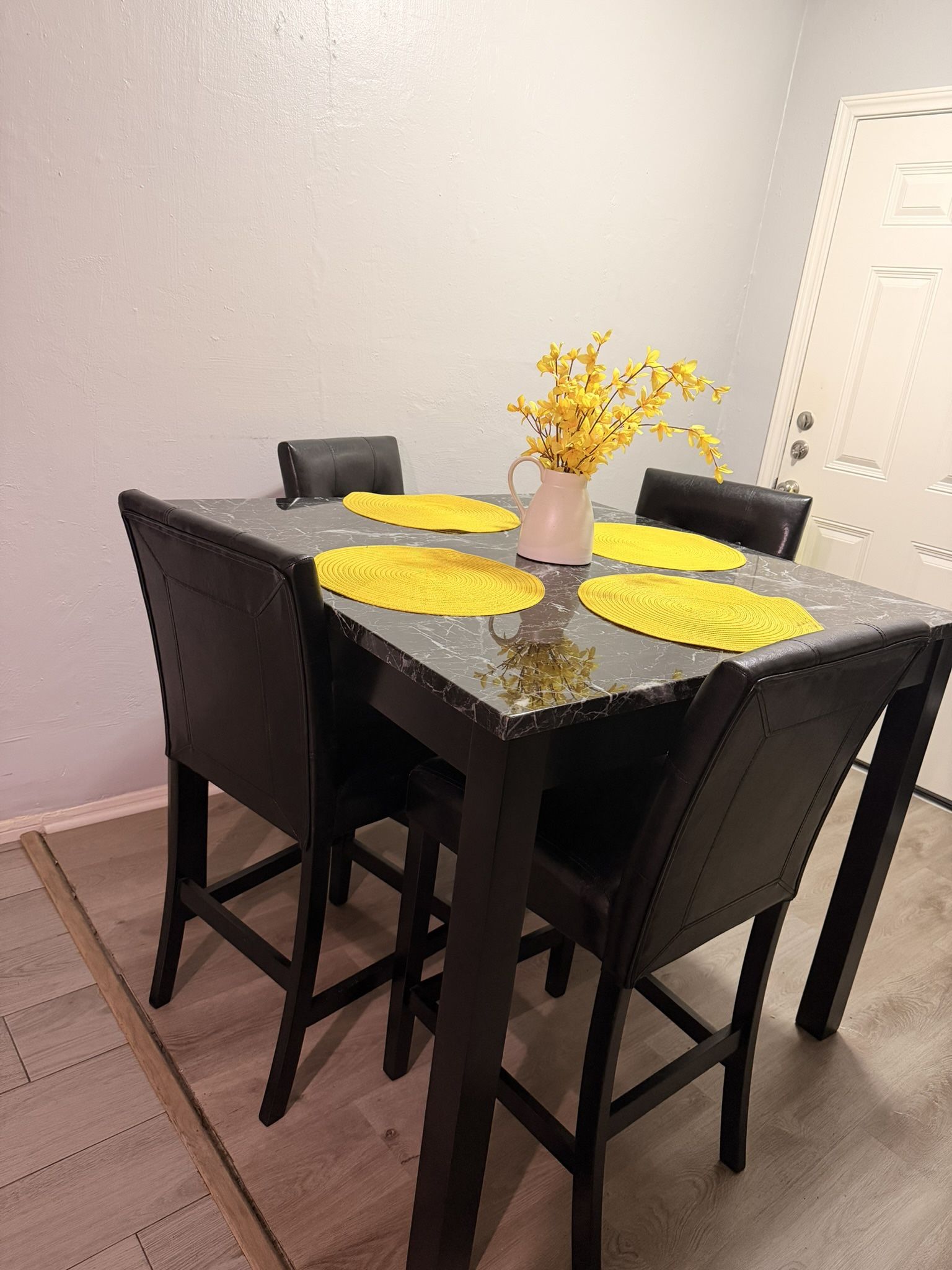 Black ceramic marble top with 4 chairs great for small dining area, back patio, or for a he/she shed negotiable