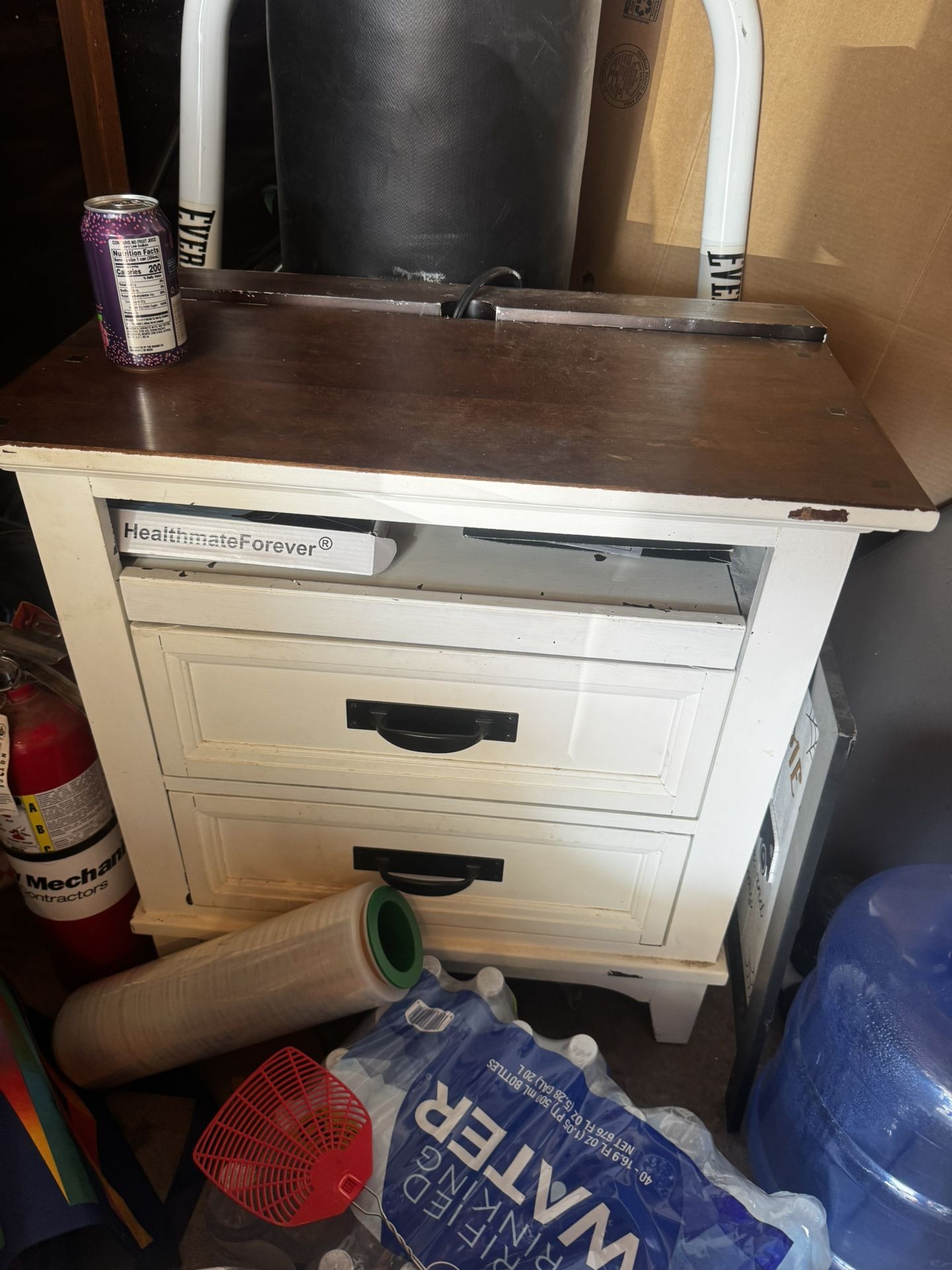 Distressed white and brown night stand with built in plug. Works perfectly fine just changed my furniture. Needs to be cleaned it has been sitting in my garage