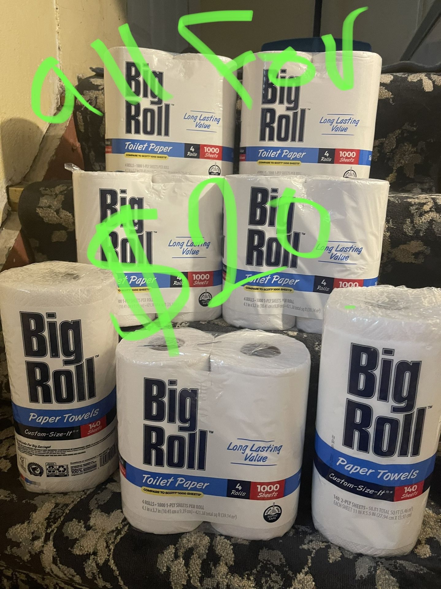 20 Rolls Toilet tissue Big Roll 2 rolls paper towels All for $20 No change on price No return No Tax