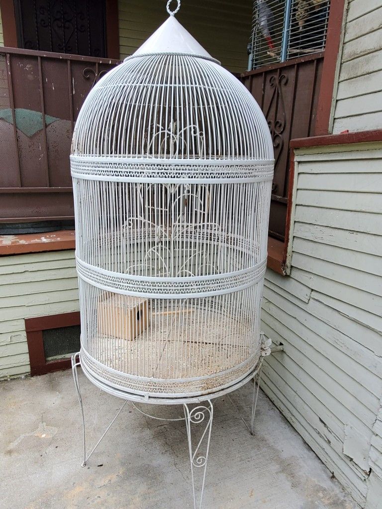 White Bird Cage with Welding Swings See description. Large/Tall: Approximately 6.5 ft tall. Circumference: 105 inches.