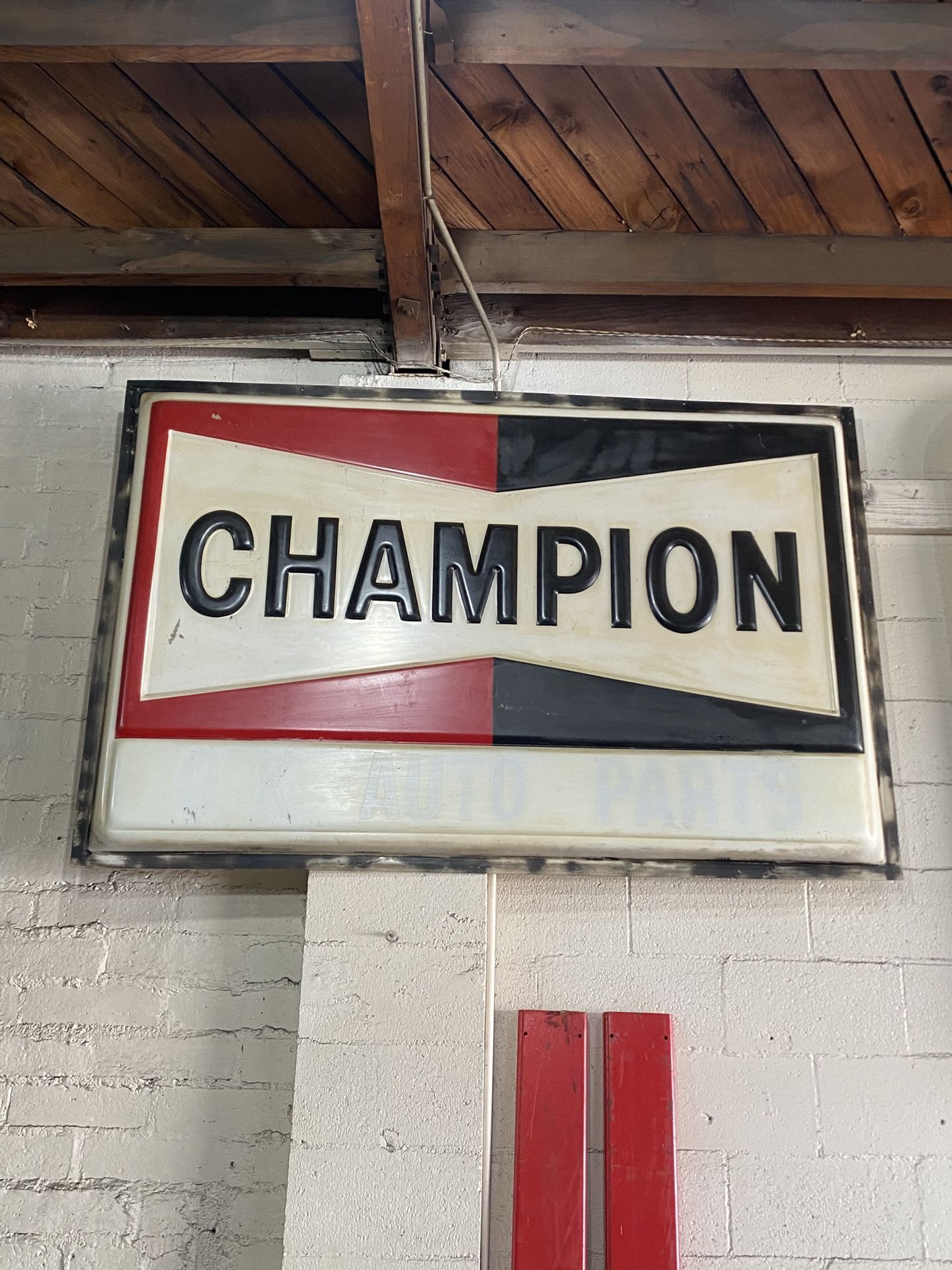 Vintage CHAMPION sign Great condition No crack Dimensions 72.5" wide, 47.5" hight Cash and pickup only No hold no delivery Located in Lynwood
