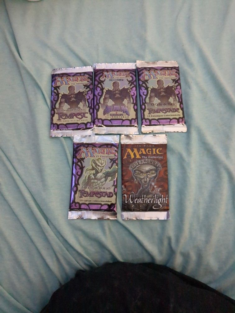 5 unopened booster packs from Magic the Gathering; one Weatherlight and four Tempest. these packs are out of print. all are foreign edition.
