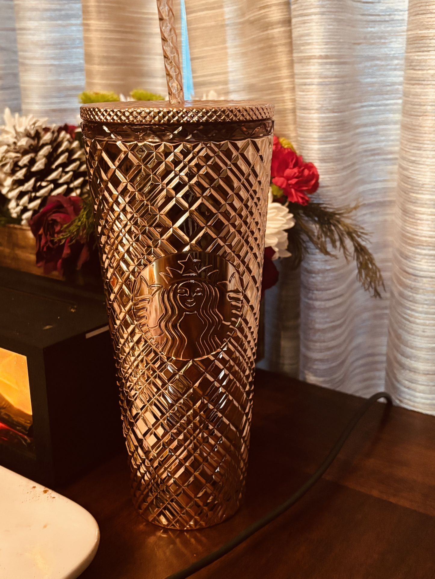 This is a Starbucks rose gold jeweled or studded metallic cold cup tumbler. Venti size, like new