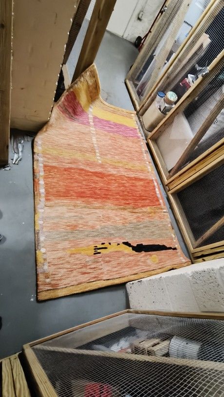 5' x 8' Wool Rug, lightly used, very good condition, no pets and no smoking. Originally bought for $265. Put a new floor and we don't need it any more. Original description below. Rug Size: Rectangle 5' x 8' Overall Dimensions 60'' W X 96'' L Overall Product Weight 27 lb. Rug Size Rectangle 5' x 8' Pile Height 0.12'' H Details Material Wool Technique / Weave Hand Woven Pattern Abstract Location Indoor Non-Slip Backing No Reversible No Backing Material Latex Product Care Spot clean with a damp cloth, and if the stain persists use an approved mild soap or cleaning solution Imported Yes Color Brown, Pink, Orange Warm up your space with bold use of color. This area rug draws on its sunset tones and subtle border for a playful abstract design. Handwoven in India from 100% wool, it's a resilient rug that handles heavy traffic in busy rooms. It features a tufted design with different bands of orange, brown, and pink tones for a bright look wherever you roll it out. The average 0.12" pile height keeps this rug low enough to let doors pass over easily and stay easy to clean.