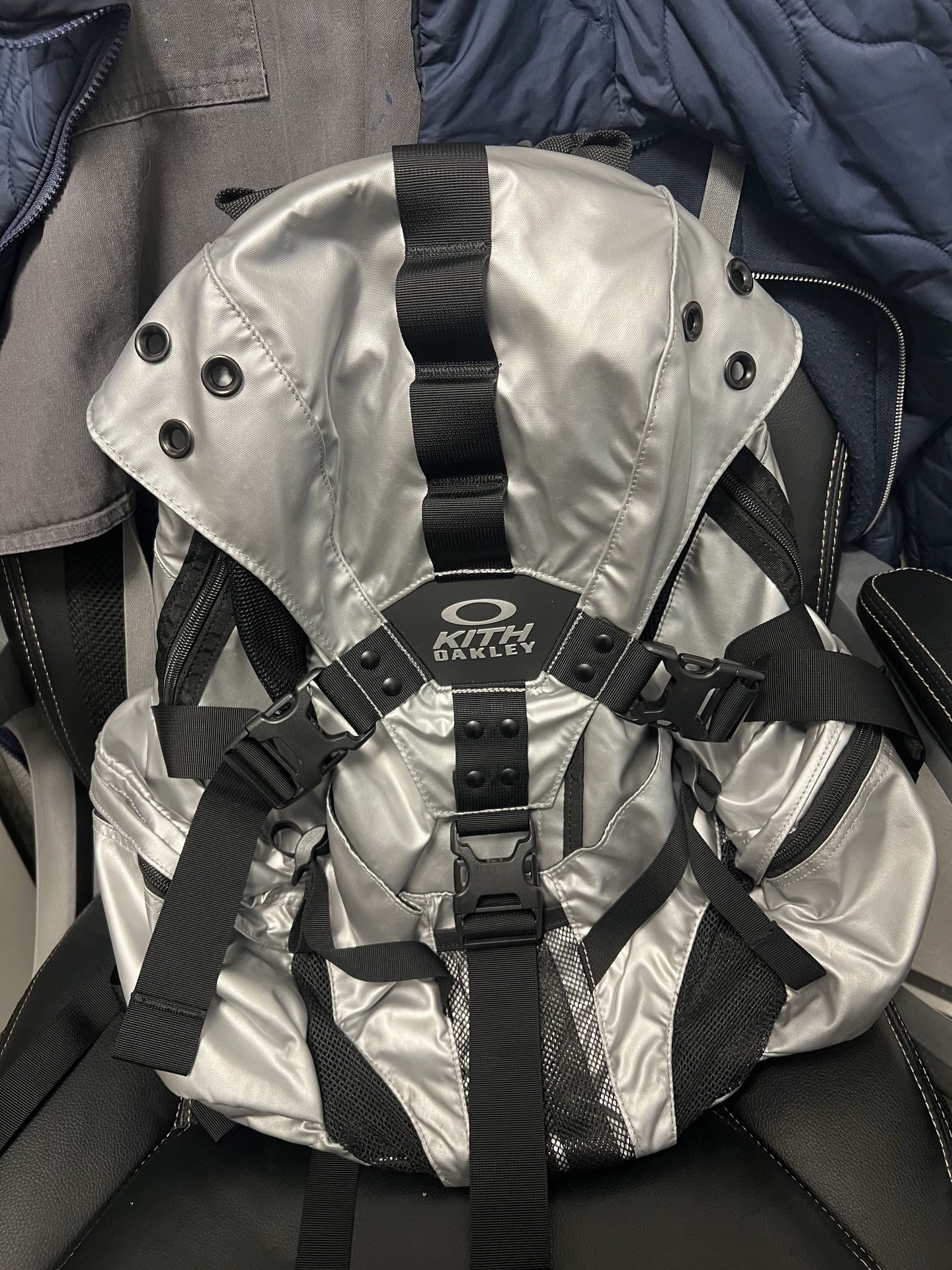 Very lightly used kith X Oakley collab backpack. Color is a metallic silver 32G capacity Nice backpack, has hole for water to drain through if it even gets through it’s nice quality Price over 200 retail no longer available