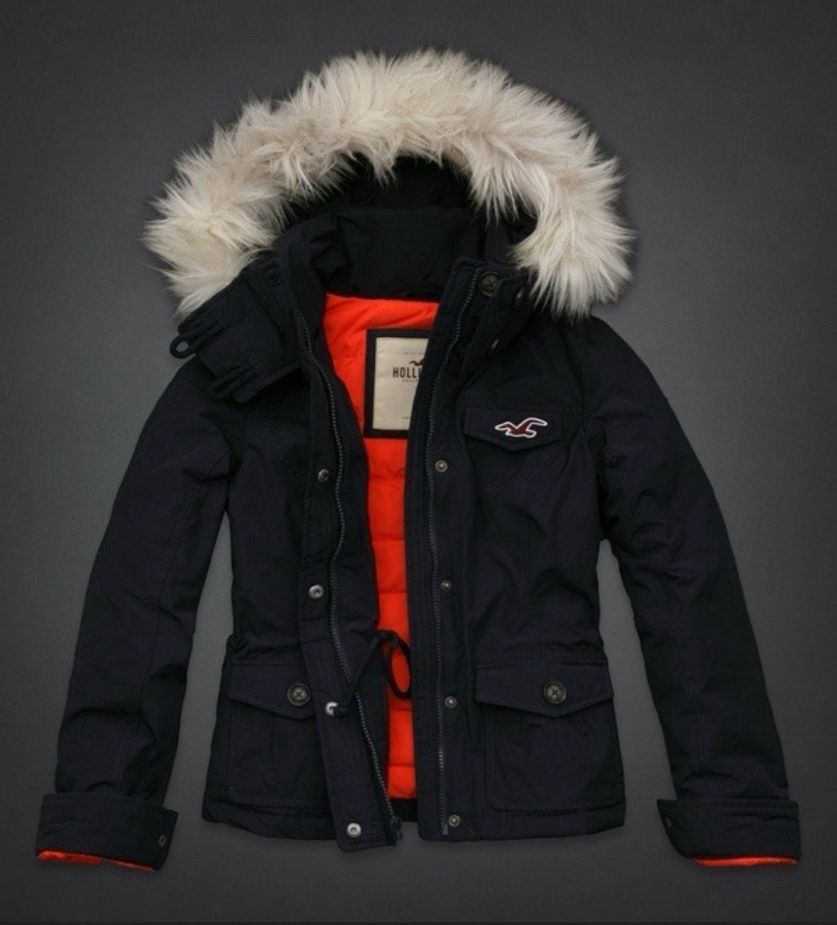 This jacket is a vintage Hollister Ramona Parka, a popular Y2K-era piece known for its navy blue exterior and bright orange quilted lining. It features a faux-fur trimmed hood, a full-zip front with a button-down storm flap, and two large front utility pockets with button closures.