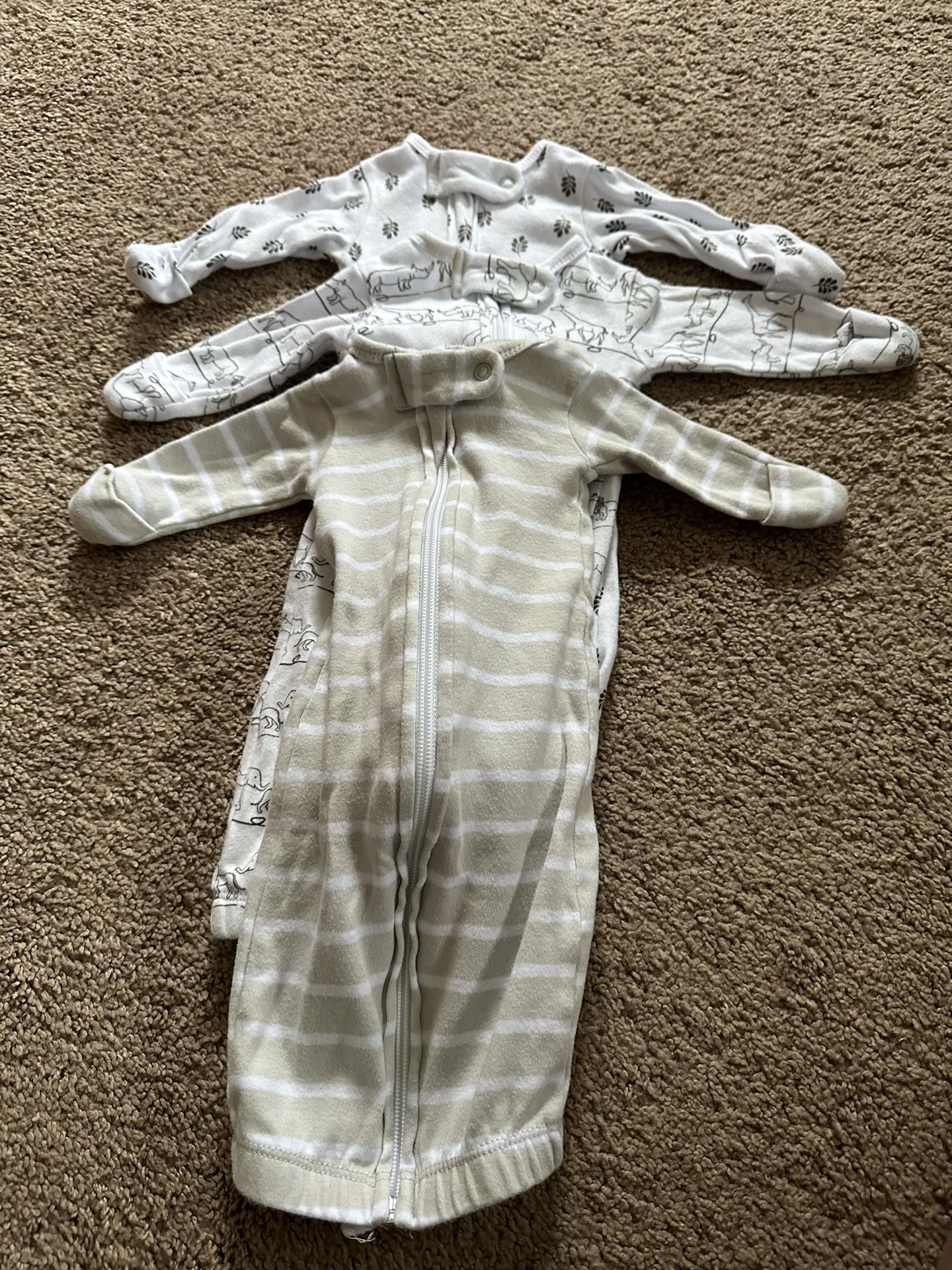 Excellent used condition mittened gowns. Zippers in great condition. Washed in 7th generation detergent.