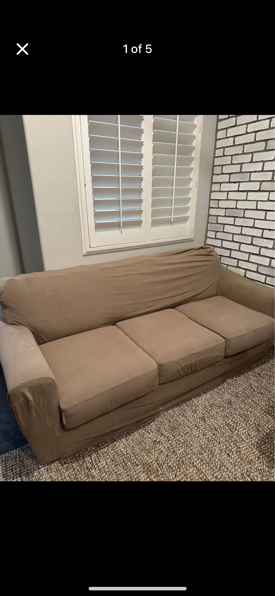 Sleeper Sofa - 3 cushion, 86” wide, 42” Depth, 34” height ( back) and 22” height ( front-arms) and 16” height ( front -cushion). Sofa is a Dark blue gray color, brown cover included, cat scratch damage on each front corner. Pull out bed