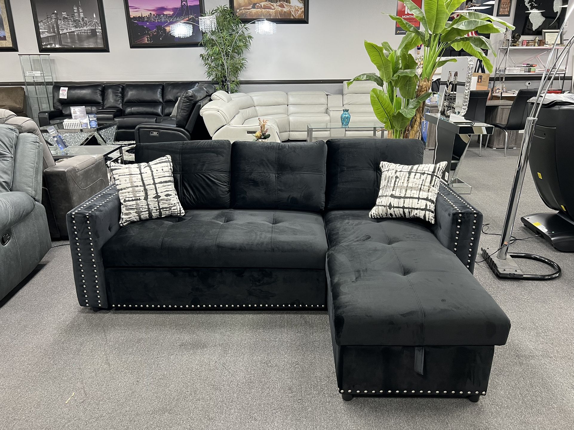 Black Velvet Sofa Sectional w/ Pull- Out Sleeper & Storage In Chaise
