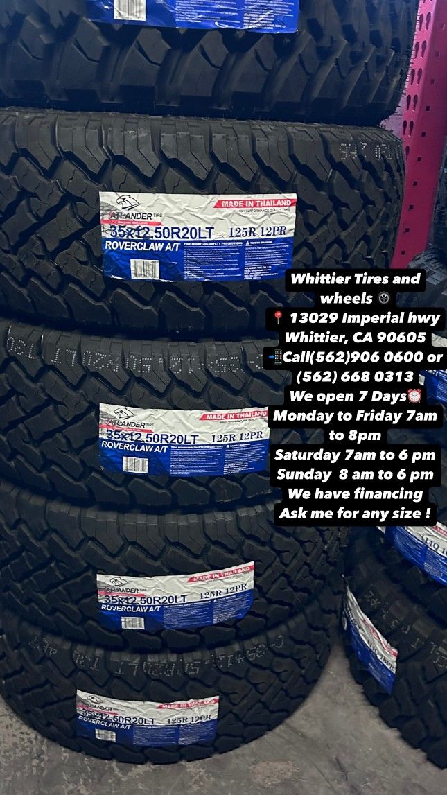 WHITTIER TIRES 13029 IMPERIAL HWY WHITTIER CA 90605 CALL (562)906-0600 TEXT (562)413-6926 - WE HAVE THE BIGGEST USED & NEW TIRE INVENTORY AVAILABLE, ASKS US FOR ANY SIZE YOU NEED. FINANCING OPTIONS AVAILABLE, 90 DAY NO INTEREST! HABLAMOS ESPAñOL. OPEN MONDAY-FRIDAY 7AM-8PM, SATURDAY 7AM-6PM, SUNDAY 8AM-5PM 185/65/14 175/65/15 185/55/15 185/65/15 195/65/15 205/55/16 215/55R16 215/60/16 205/65/16 245/75/16 265/70/16 285/75/16 265/75/16 215/45/17 225/45/17 225/50/17 215/50/17 215/55/17 235/65/17 245/65/17 255/65/17 265/70/17 285/70/17 33x12.50r17 215/45/18 225/40/18 235/40/18 235/45/18 245/45R18 235/60/18 245/60R18 265/60/18 255/70/18 265/70/18 33x12.50r18 225/40/19 235/40/19 245/40/19 245/45/19 245/35/20 245/45/20 245/50/20 255/50/20 265/50/20 275/55/20 275/60/20 33x12.50r20 35x12.50r20 37/13.50R20 265/35/22 285/45/22 305/40/22 305/45R22 33x12.50R22 295/35/34 305/35R24 ESPECIAL DE LLANTA NUEVA Y USADA GOODYEAR MICHELING BRIDGESTONE FIRESTONE CONTINENTAL ARROYO YOKOHAMA PIRELLI KUHMO TOYO ATLANDER LANDGOLDEN LANDSPIDER LLANTAS TIRES WHEELS
