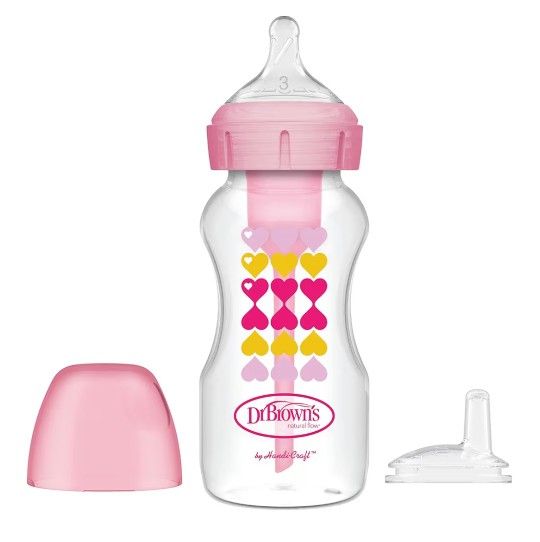 Dr. Brown’s Anti-Colic Options+ Wide-Neck Sippy Bottle Starter Kit, 9oz/270mL, with Level 3 Medium-Fast Flow Nipple and Soft 100% Silicone Sippy Spout, Pink, BPA Free, 6m+