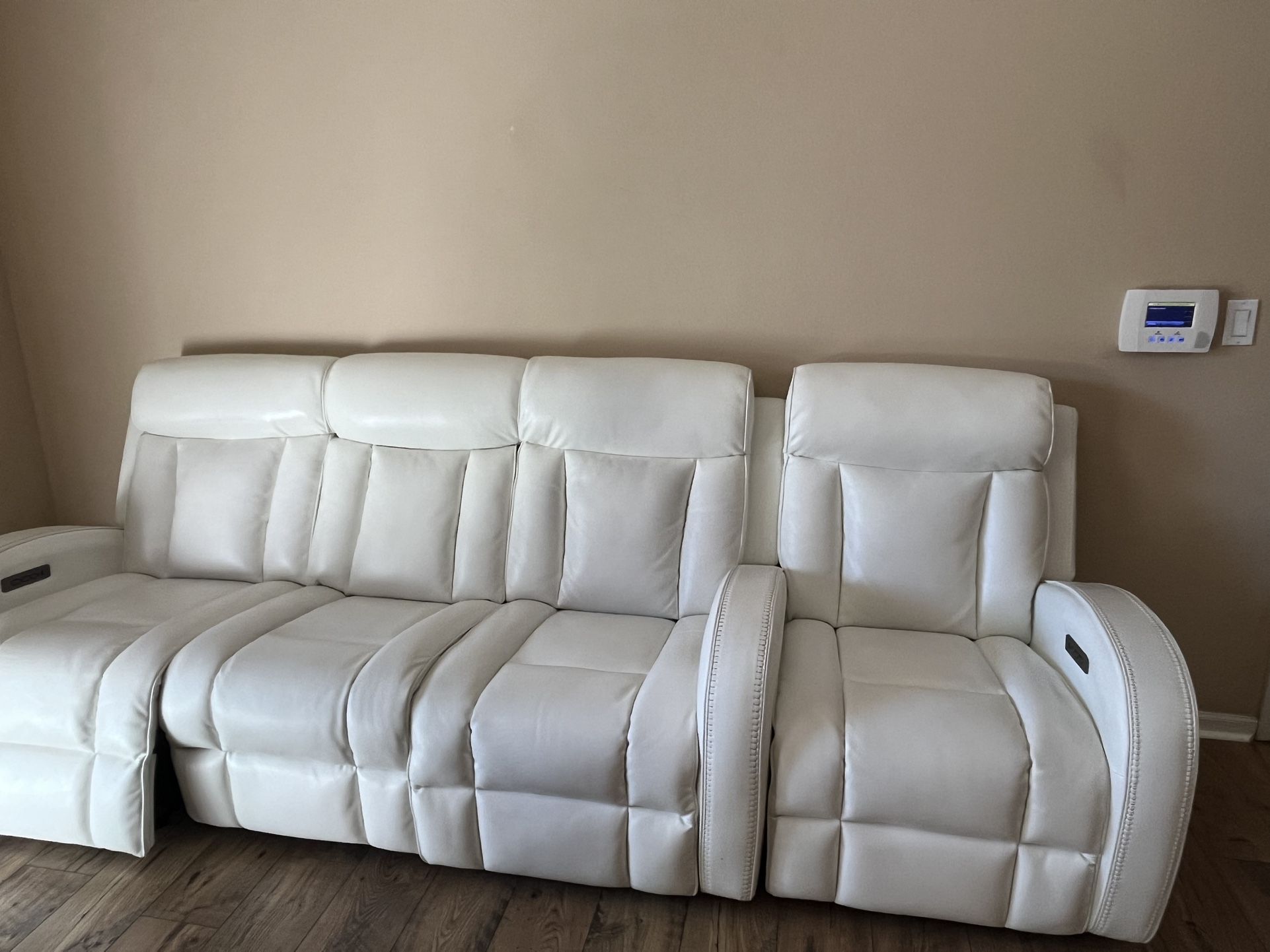Great leather couch from Bobs Furniture. One of the seats are stuck in its position you just need to purchase the cord to plug it in to use the reclining feature. Clean. Just a few very small stains. It’s two pieces. I bought it this way I just pushed them together and make it look like one big couch.