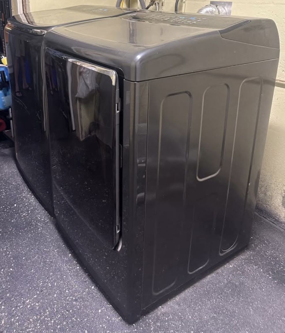 Samsung 7.4 cu. ft. Electric Washer & Dryer with Integrated Controls in Black Stainless Steel. Both work great. Washer has a scratch on front from moving shown in picture.