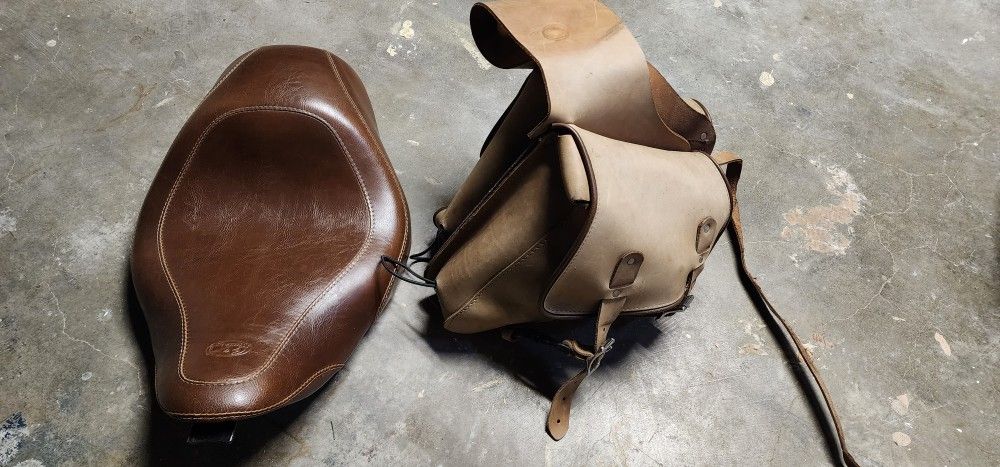 Mustang brand, brown leather solo seat. In great condition! Brown saddle bags included. A little faded but functionality is great! 350 OBO Thanks for lookin!
