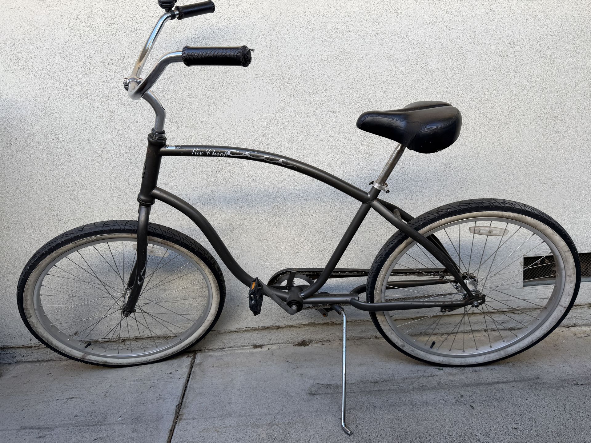 Classic “The Chief” beach cruiser in matte black. Very comfortable upright riding position with wide handlebars and padded saddle — perfect for casual rides around the neighborhood, beach, or bike paths. Bike is in good used condition and rides smoothly. Simple single-speed cruiser design makes it low maintenance and easy to ride. Features: • Classic beach cruiser frame • Comfortable padded seat • Wide cruiser handlebars • Smooth rolling tires • Kickstand included • Single speed (simple & reliable) Great bike for cruising around town or the beach. Pickup in Yorba Linda.
