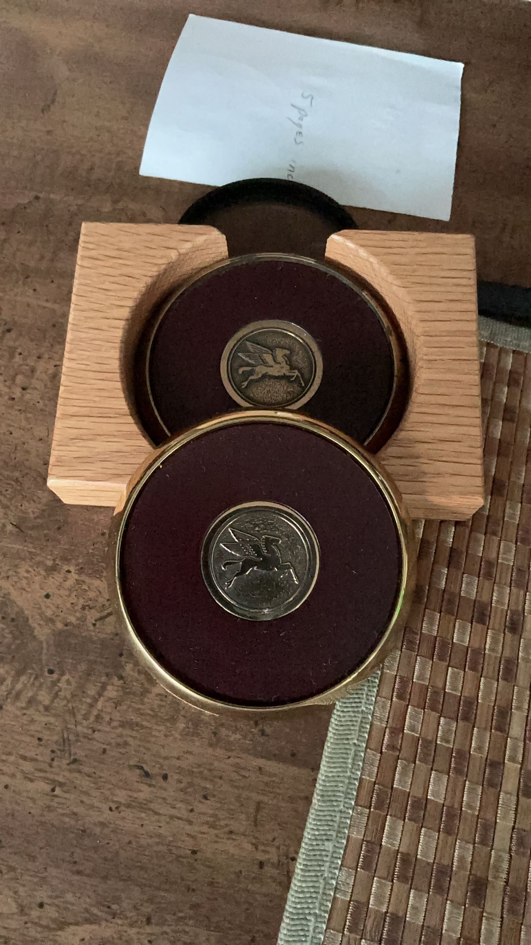 Mobil Pegasus Brass and Leather Coasters 3 3/4” width 5 1/2” x 4” wood holder Coasters have cork backing Brass is tarnished in spots