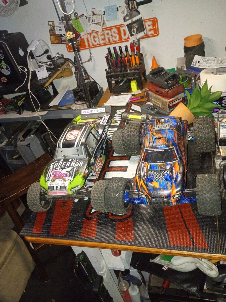 Traxxas Rustler:Brushless Spectrum Firma 4000KV motor, Traxxas Servo, 30C battery, Aluminum front and rear control arms, Aluminum front shocks.. all spectrum and Traxxas parts it runs great but just needs a fresh body and some matching wheels.. ECX MT : Brushed Traxxas titan 12 turn motor , Quicrun esc and servo all water proof, upgraded aluminum front and rear shocks, upgraded front and rear aluminum tie rods runs great just needs a new spur gear