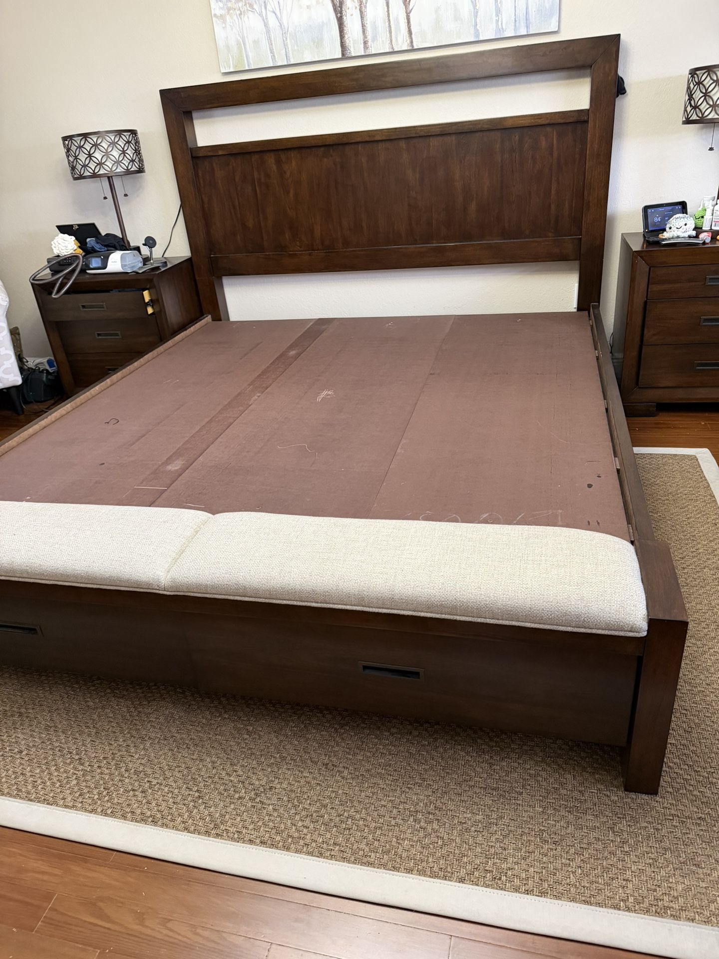 Selling a king size solid wood platform bed with two drawers for storage and bench at the end.