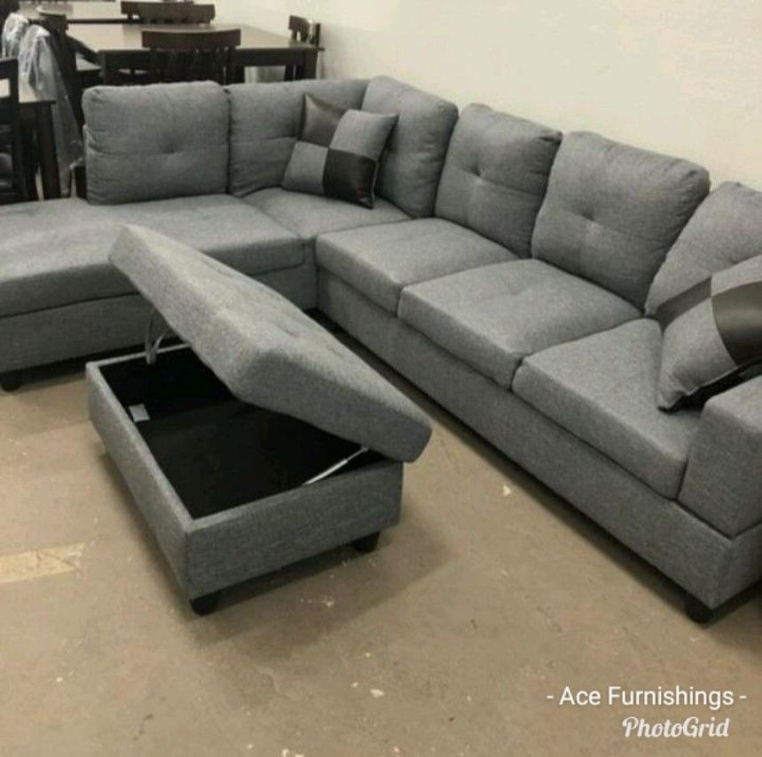 Brand New Grey Denim Linen Sectional Set With Decorative Pillows & Storage Ottoman