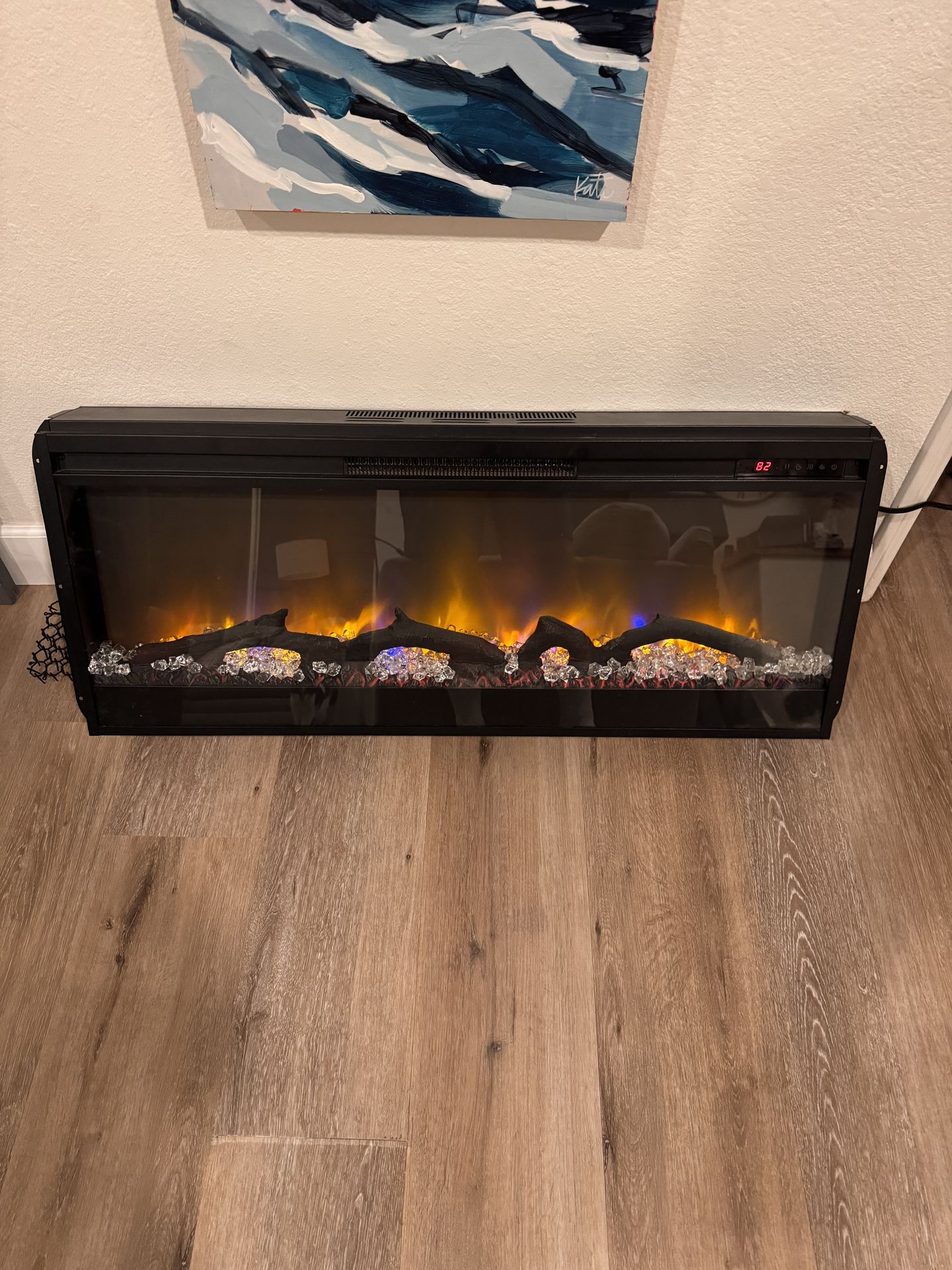 Lights and fake flames. Outputs heat. With remote. Was pulled from a media cabinet.