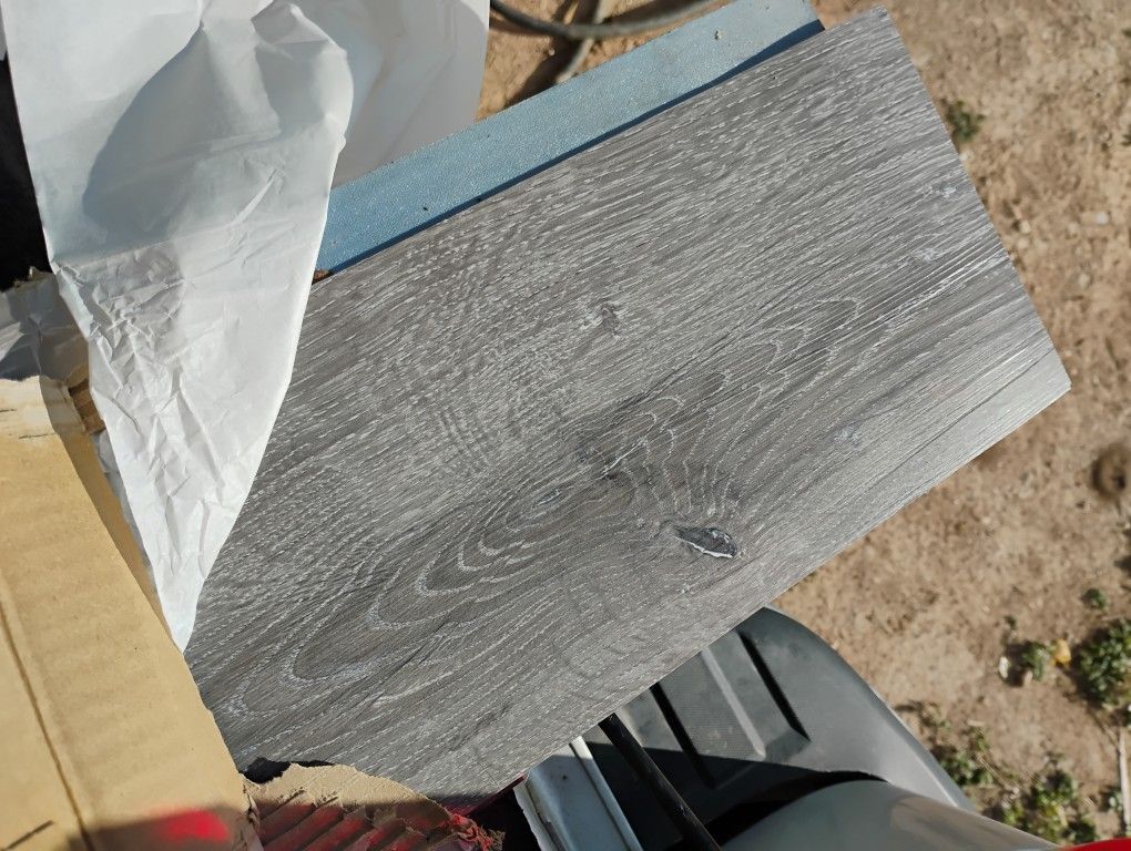 Grey stick-on tile plank flooring. Covers 950 sq ft / 36 boxes.